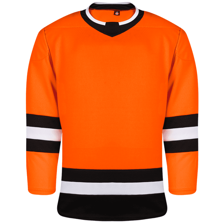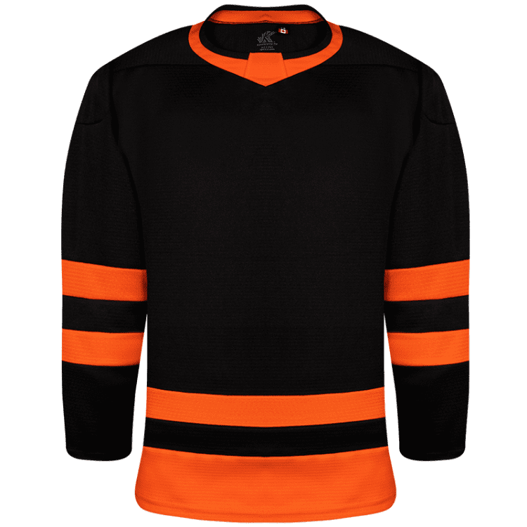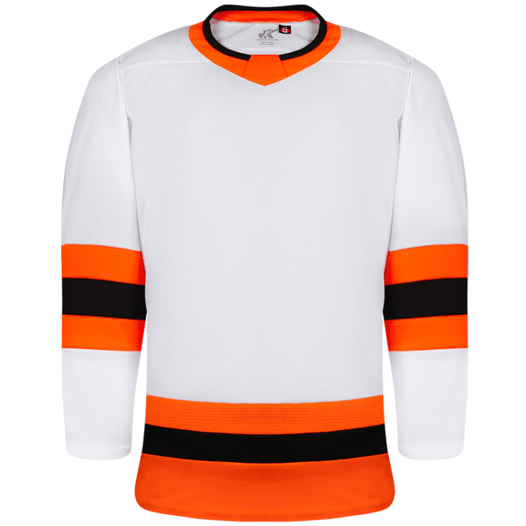 Kobe K3GLPHI blank hockey jerseys feature pro weight Kobe K3G air-knit fabric with Philadelphia Flyers team colors. Kobe K3GLPHI home, away and 3rd black league hockey jerseys also feature single material on the shoulders / elbows, K3G crew neck with inlay, and double needle stitching. Choose from youth through adult goalie sizes.