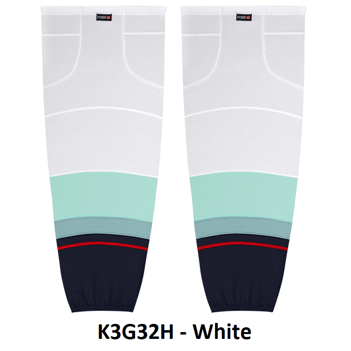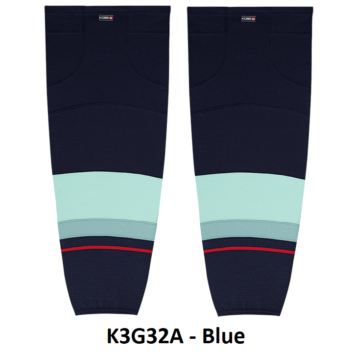 Seattle Kraken air knit hockey socks in Kobe K3G jersey fabric with velcro tabs and elastic cuffs. Kobe K3GS32A K3GS32H Seattle Kraken edge mesh hockey socks feature a pro quality ergonomic fit with authentic Kraken ice blue colors. Choose from adult, intermediate and youth sizes. Made in Canada.