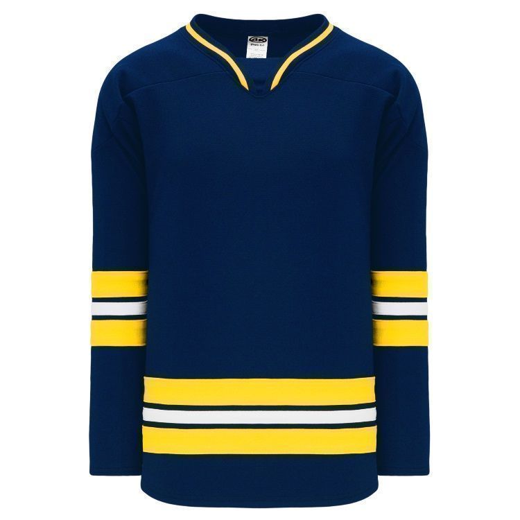 Michigan blank hockey jerseys feature pro-weight AK-Knit fabric with authentic University of Michigan sewn striping pattern. AK MIC787B MIC788B MIC789B home, away and 3rd yellow Michigan blank hockey jerseys also feature 2-layers of material on the shoulders / elbows, a v-neck or lace up neck design and reinforced construction. Buy blank or customize with screen printing or tackle twill. Choose from youth through adult goalie sizes. Made in Canada.