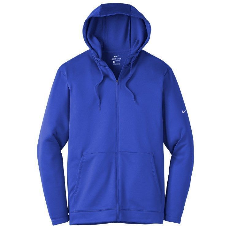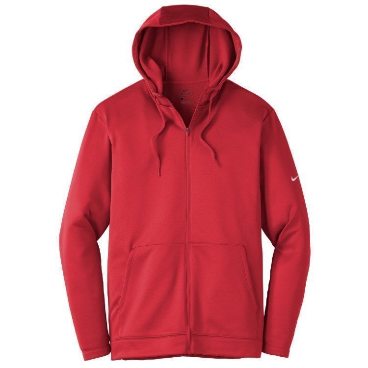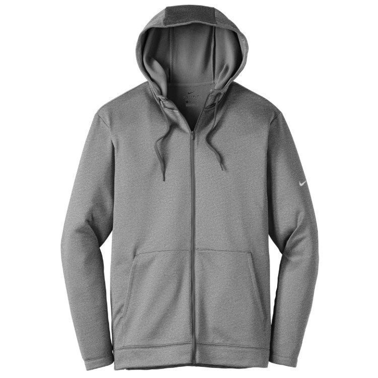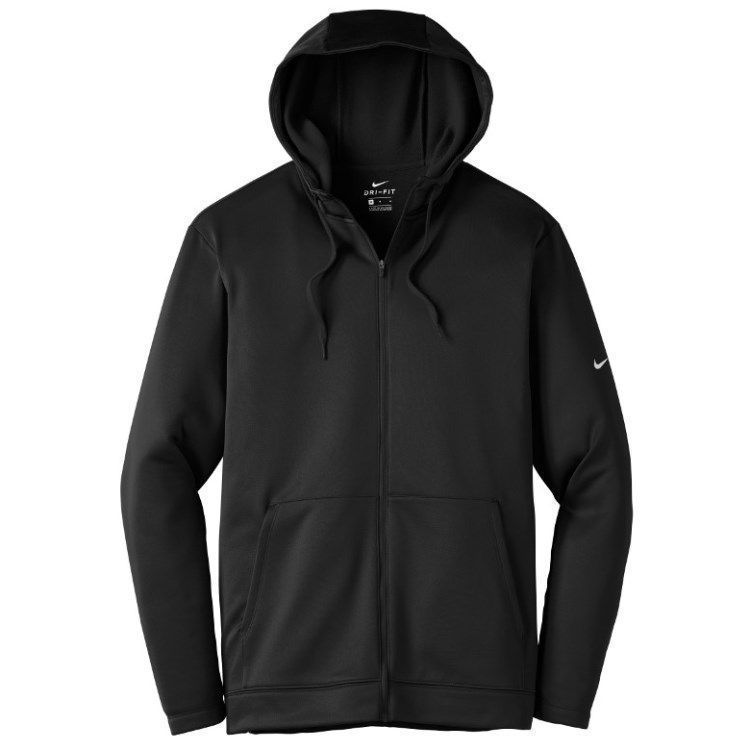 Nike Golf full zip fleece hoodie in 7 oz. polyester Therma-Fit fabric. Nike Golf NKAH6259 zip up hoodies have a full zip front, 3-panel hood with drawcord, pouch pockets, open cuffs, tag free heat seal label and Nike Swoosh logo on the left sleeve. Prices include custom logo embroidery.