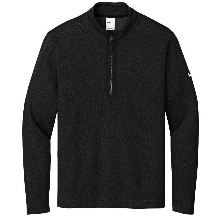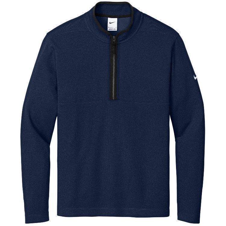 Nike Golf 1/2 zip pullover in 6.3 oz. textured polyester wicking fabric. Nike Golf NKDX6702 pullovers have a half zip front, notched collar and zipper, open cuffs and open bottom hem, tag free heat seal label and embroidered Nike Swoosh logo on the left sleeve. Prices include custom logo embroidery.