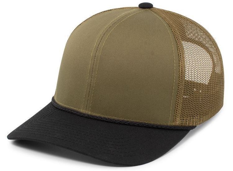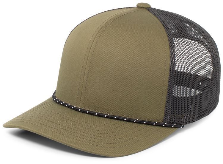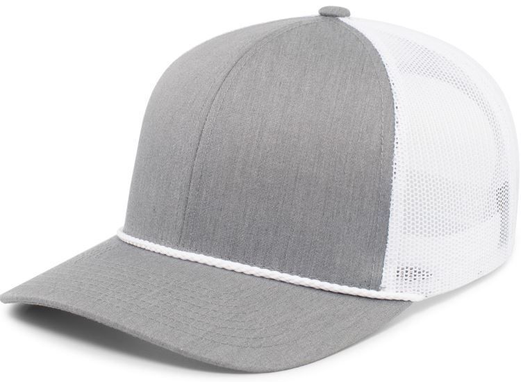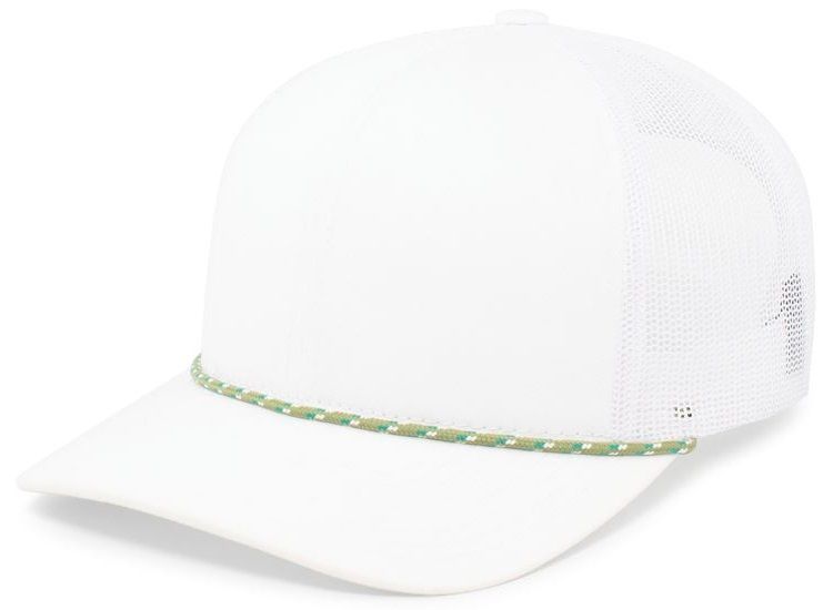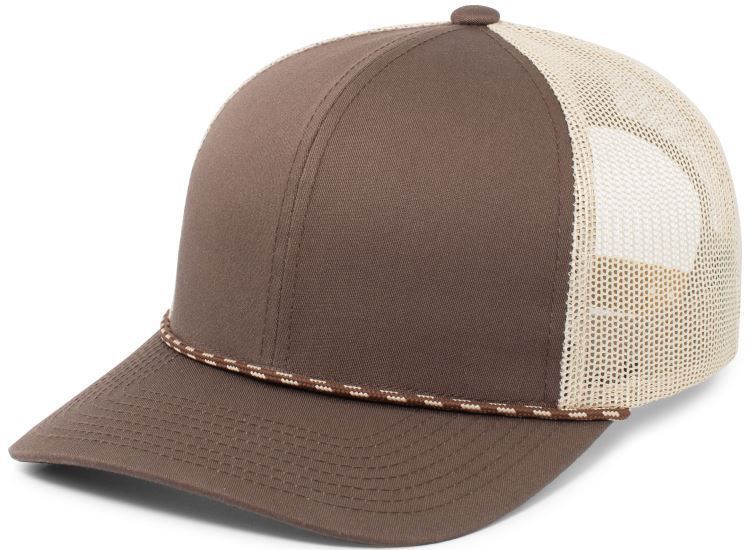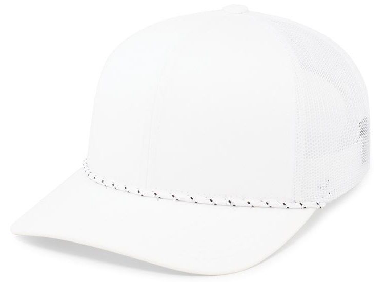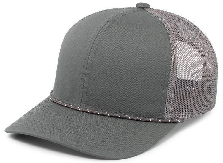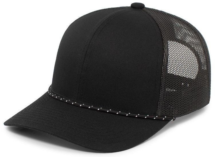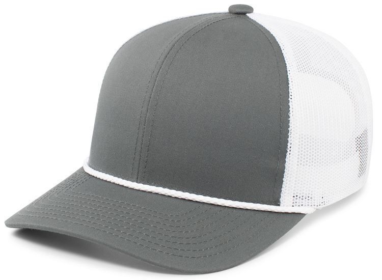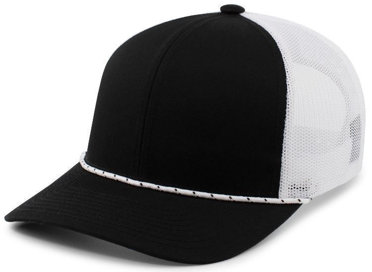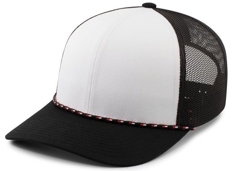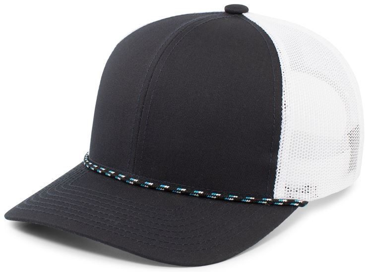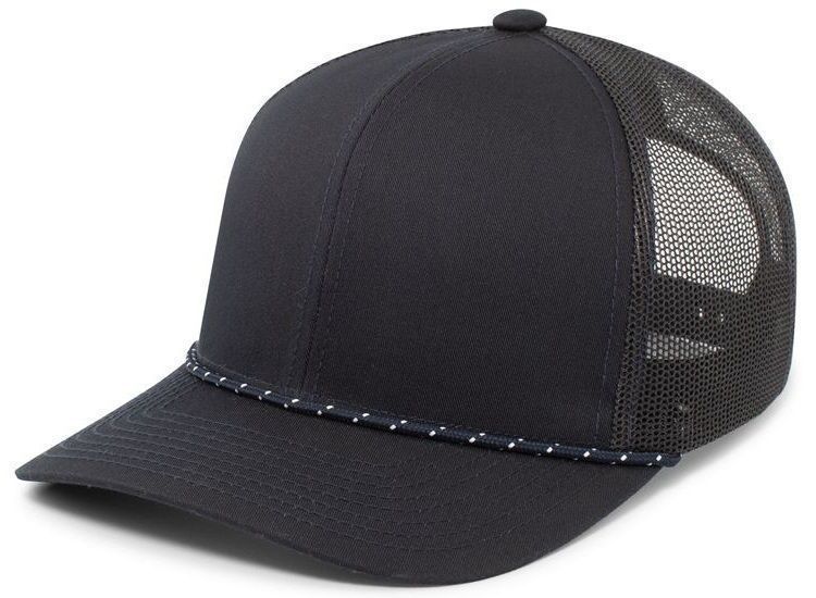 Pacific 104BR Mesh Back Rope Trucker Cap features poly cotton front panel with mesh back design and contrast color bill rope. Pacific 104BR cap has a mid profile, Pro-Stitch finish, 8 rows of stitching, slight curved visor, adjustable snap back and self material under visor.