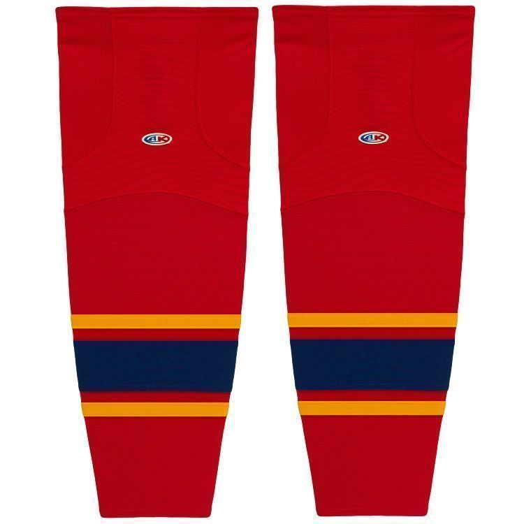 Florida Panthers air knit hockey socks in home and away styles. Florida Panthers air-knit hockey socks in stock in adult, intermediate and youth sizes in authentic Florida red and white sewn striping. Athletic Knit HS2100 air-knit hockey socks feature pro weight edge style air knit fabric with Dry-Flex wicking stretch panels and two sewn Velcro tabs.