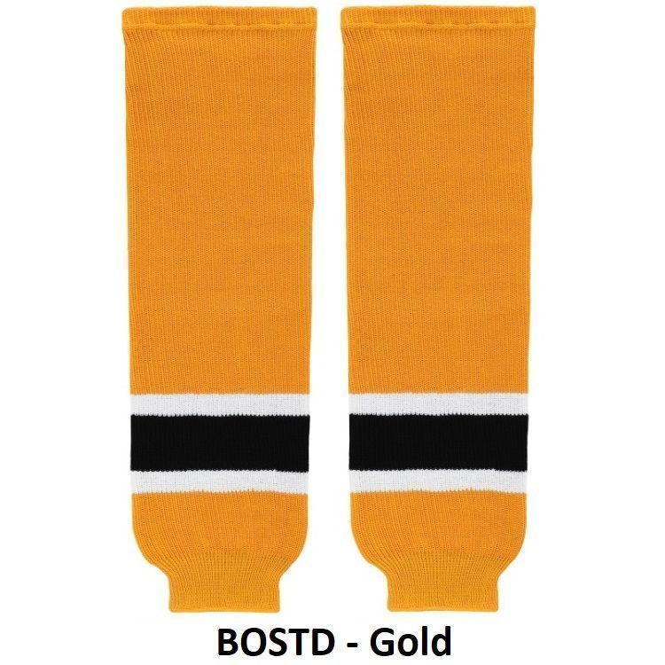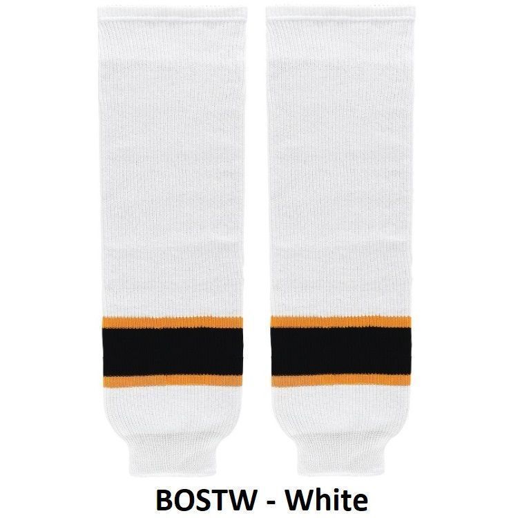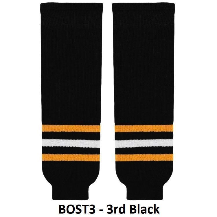 Boston Bruins hockey socks in home, away and 3rd styles. Boston Bruins knit hockey socks in stock in adult, intermediate, youth and mite sizes in authentic Bruins black, gold and white stripes. PearSox knit hockey socks feature a 50% cotton / 50% polyester blended fabric. Made in the USA.