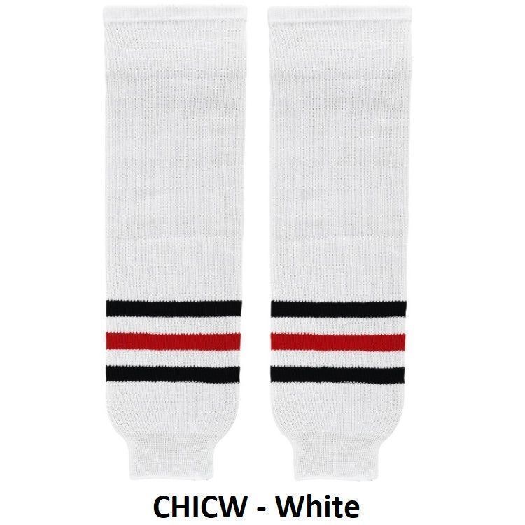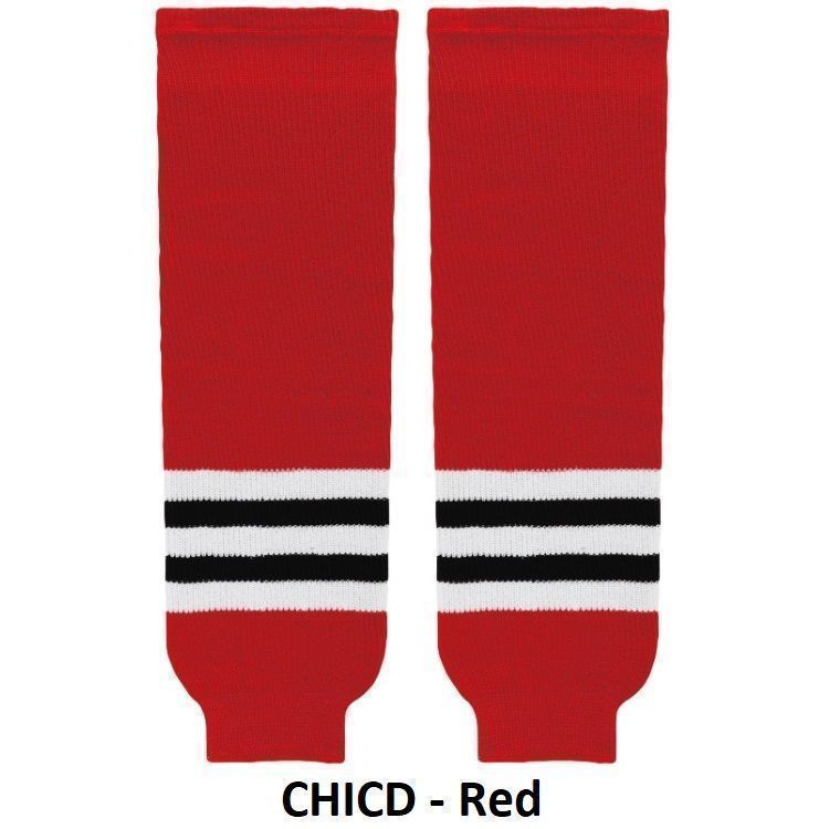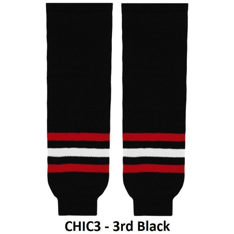 Chicago Blackhawks hockey socks in home, away and 3rd styles. Chicago Blackhawks knit hockey socks in stock in adult, intermediate, youth and mite sizes in authentic Blackhawks, red, black and white stripes. PearSox knit hockey socks feature a 50% cotton / 50% polyester blended fabric. Made in the USA.