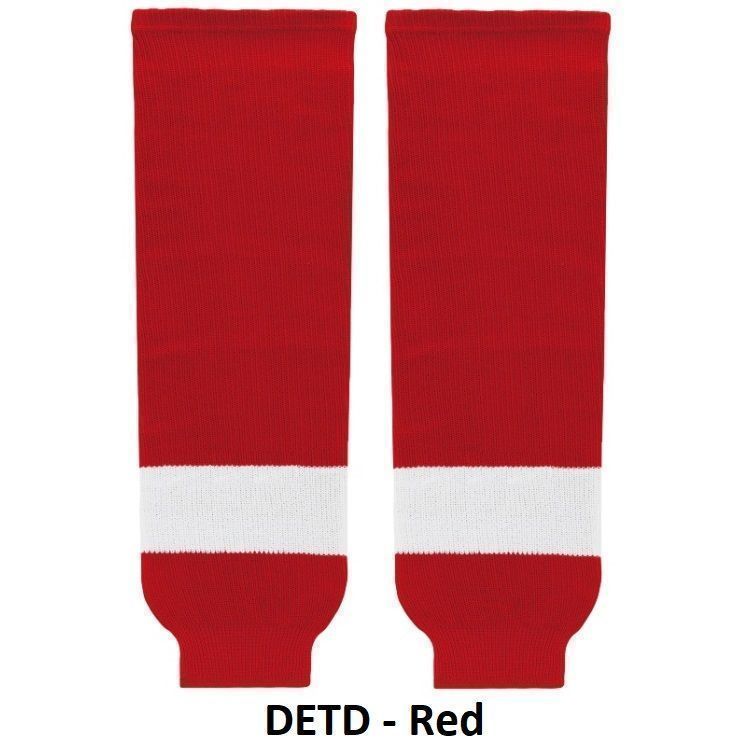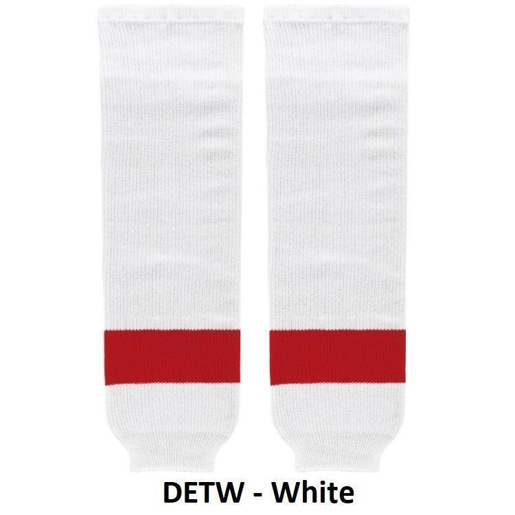 Detroit Red Wings hockey socks in home and away styles. Red Wings knit hockey socks in stock in adult, intermediate, youth and mite sizes in authentic Detroit red and white stripes. PearSox knit hockey socks feature a 50% cotton / 50% polyester blended fabric. Made in the USA.