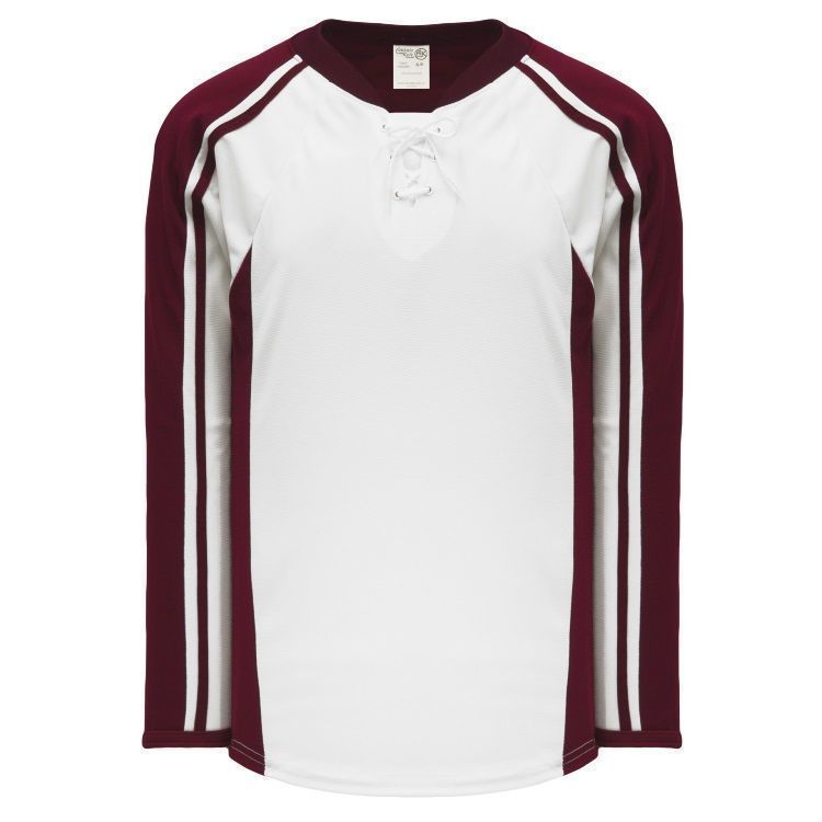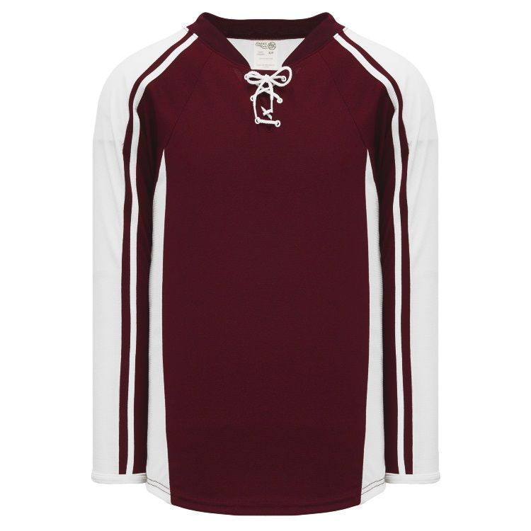 Peterborough Petes blank hockey jerseys feature pro-weight AK-Knit fabric with contrast color knitted shoulder and sleeve trim. AK PET480C PET481C home and maroon away Peterborough Petes blank hockey jerseys also feature 2-layers of material on the shoulders / elbows, a lace up neck and a rounded bottom hem. Buy blank or customize with screen printing or twill. Choose from youth through adult goalie sizes. Made in Canada.