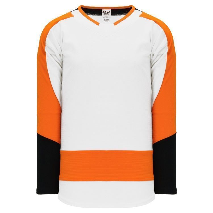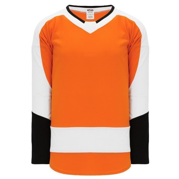 Blank Philadelphia Flyers home and away hockey jerseys feature pro-weight AK-Knit fabric with authentic Flyers striping pattern. AK PHI870B PHI871B Flyers blank hockey jerseys also feature 2-layers of material on the shoulders / elbows, edge v-necks, sewn striping and rounded bottom hems. Buy blank or customize with screen printing or tackle twill logos, numbers and player names. Purchase youth through adult goalie cut sizes. Made in Canada.