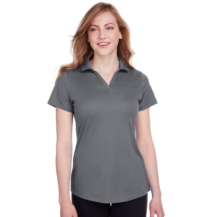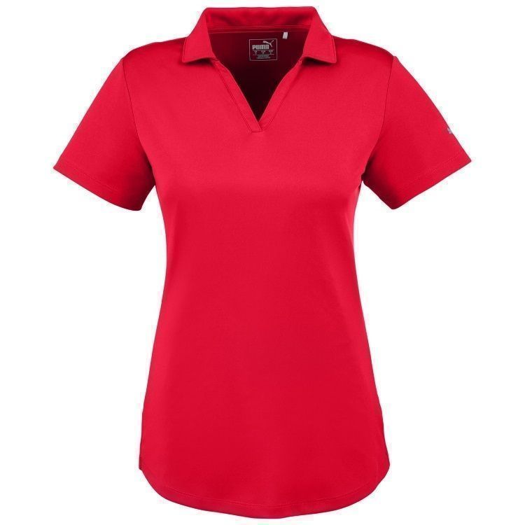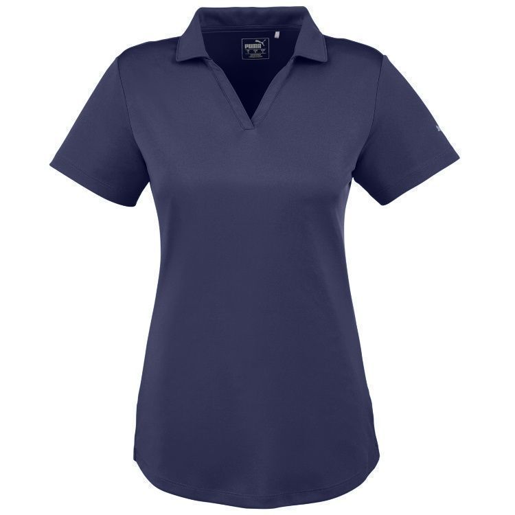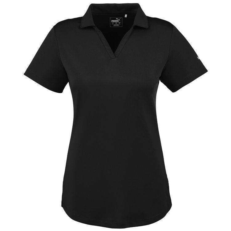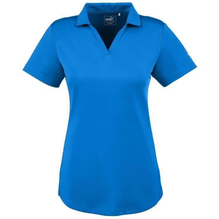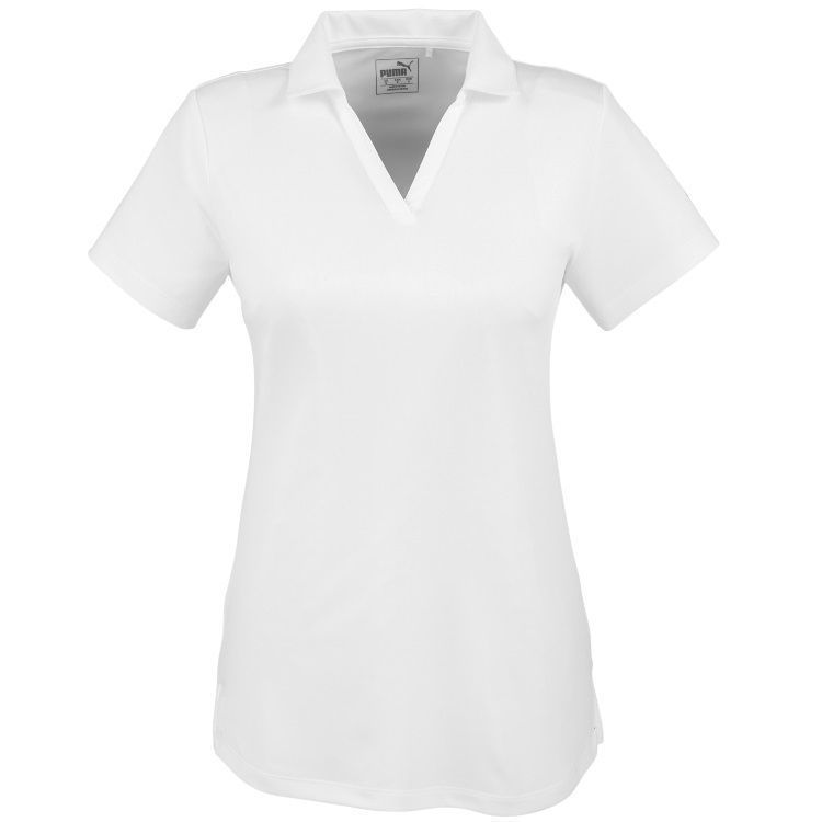 Puma Golf women's icon polo in polyester wicking fabric with a solid color design. Puma Golf 596800 polo has a v-neck, 4-way stretch and Puma Golf logo on the left sleeve. Prices include custom logo embroidery.