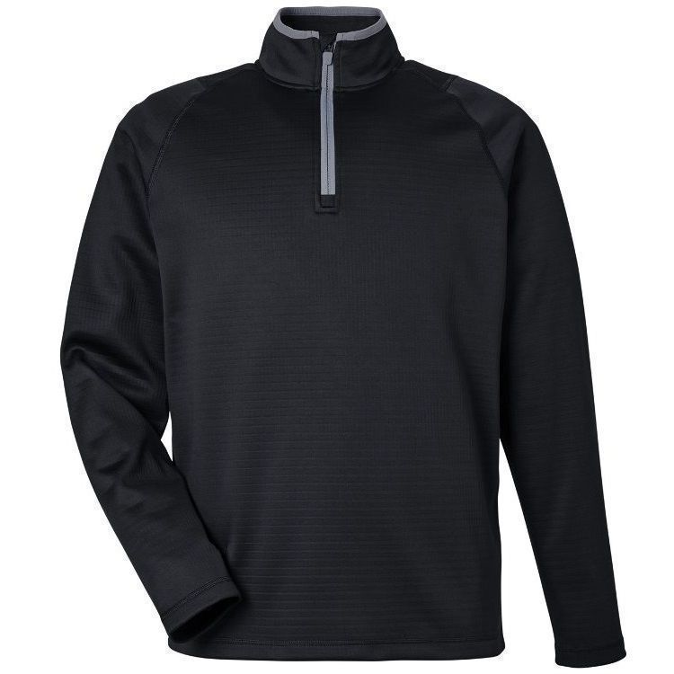 Puma Golf Waffle Fleece men's pullover in recycled 2-layer WARMCELL fabric with 4 way stretch. Puma Golf 631105 mens pullover has a 1/4 zip front, contrast color zipper detail, mock collar and flatlock stitching detail between panels. Puma Cat logo print on upper back. Prices include custom logo embroidery.