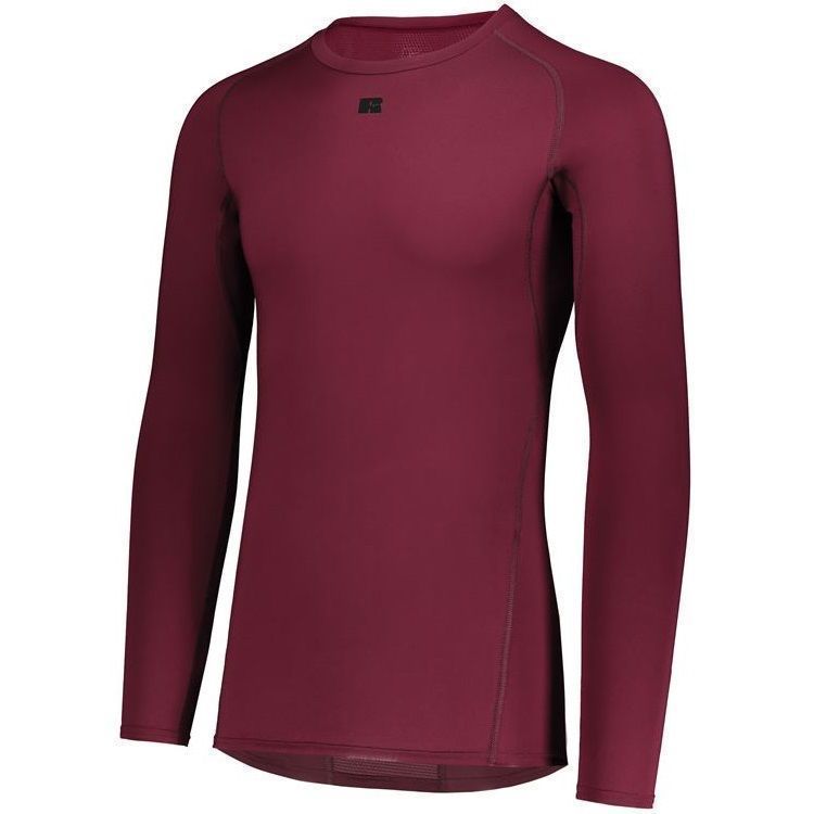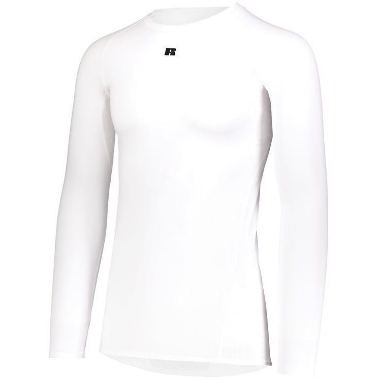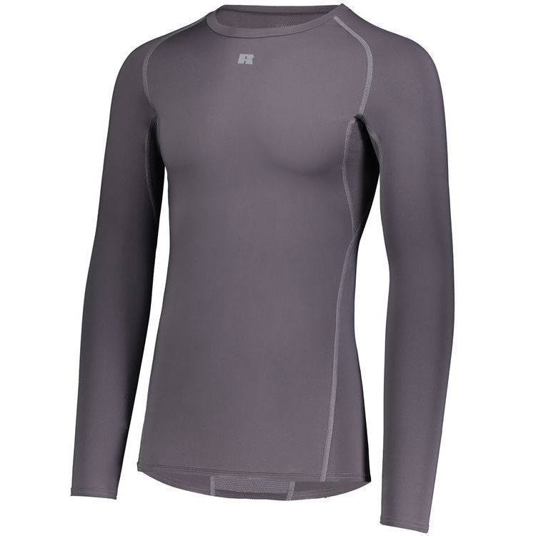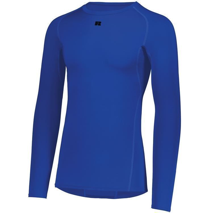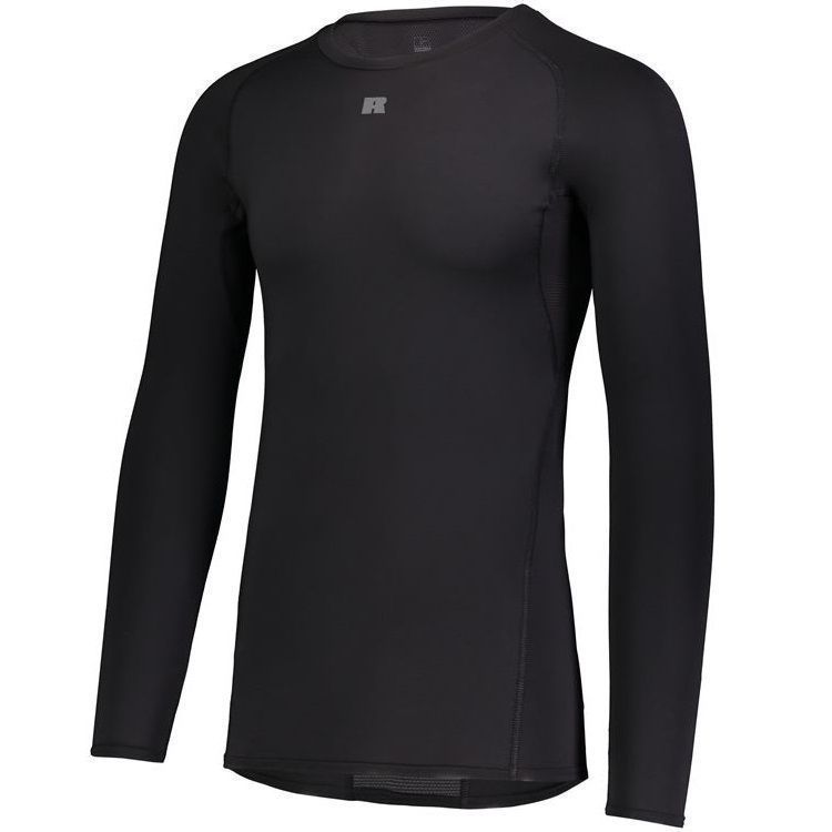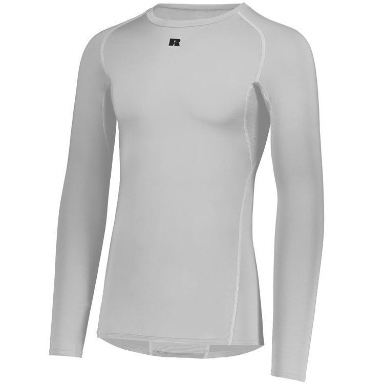 Russell R20CPM long sleeve compression crew shirt features a 84% Polyester / 16% elastane Xtreme spandex fabric with Coolcare technology and stretch mesh inserts on center back and underarms. Russell long sleeve compression crew also features 4-way stretch, 50+ UPF sun protection, crew neck and raglan sleeves. This shirt also has a muscle fit and dropped trail.