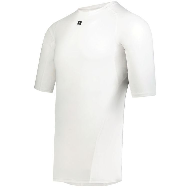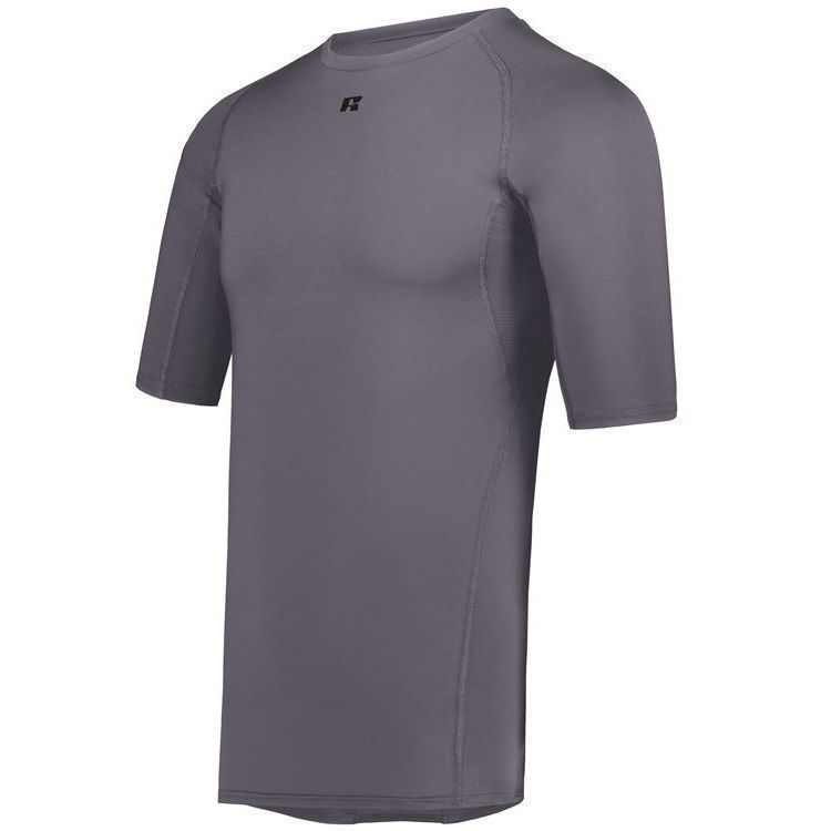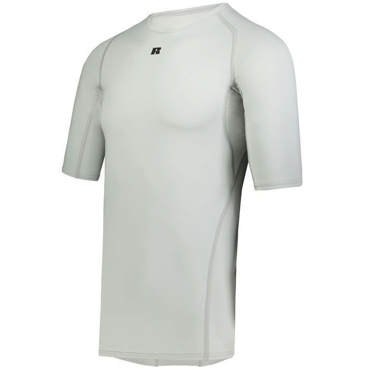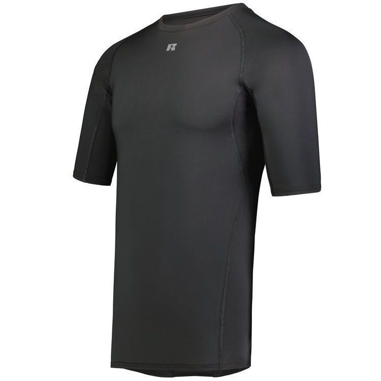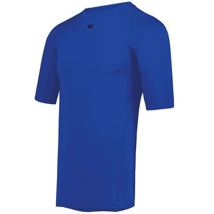 Russell R21CPM 1/2 sleeve compression crew shirt features a 84% Polyester / 16% elastane Xtreme spandex fabric with Coolcare technology and stretch mesh inserts on center back and underarms. Russell short sleeve compression crew also features 4-way stretch, 50+ UPF sun protection, crew neck and raglan sleeves. This shirt also has a muscle fit and dropped trail.