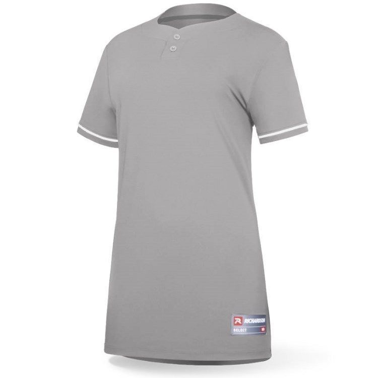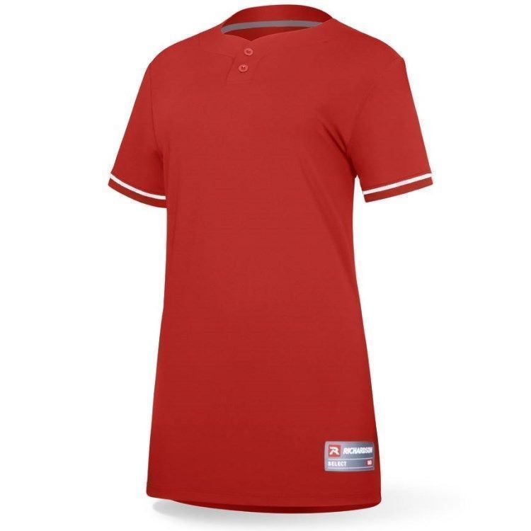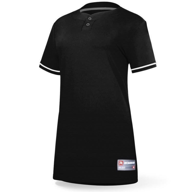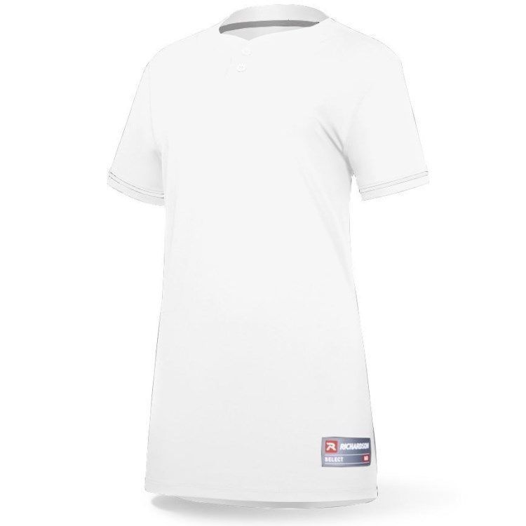 Richardson 7112W 2 button softball jersey with mid weight Stay-Dri wicking knit / 8% spandex fabric with 4-way stretch. Richardson 7112W softball jersey has a two button front, set-in sleeves, sleeve piping and double stitched bottom hem. Girls through womens 3XL sizes.