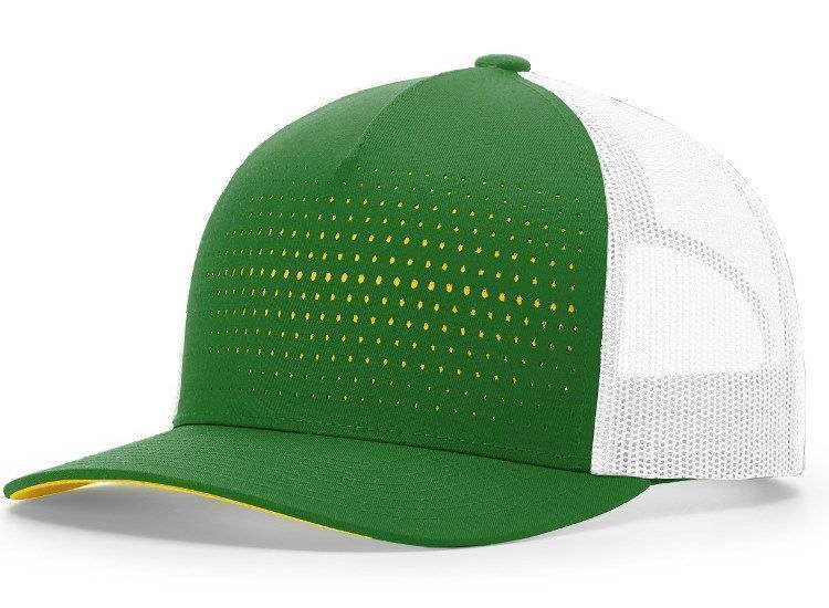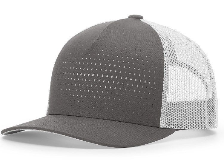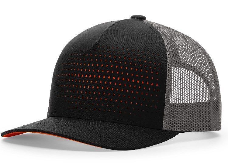 Richardson 163 Laser Cut 5-Panel Mesh Back Cap features a poly twill front fabric with laser cut holes showing contrast underlay. Richardson 163 cap has a polymesh back, mid profile design, contrast color underlay, pre curved PE visor with 8 rows of stitching and snap back style.