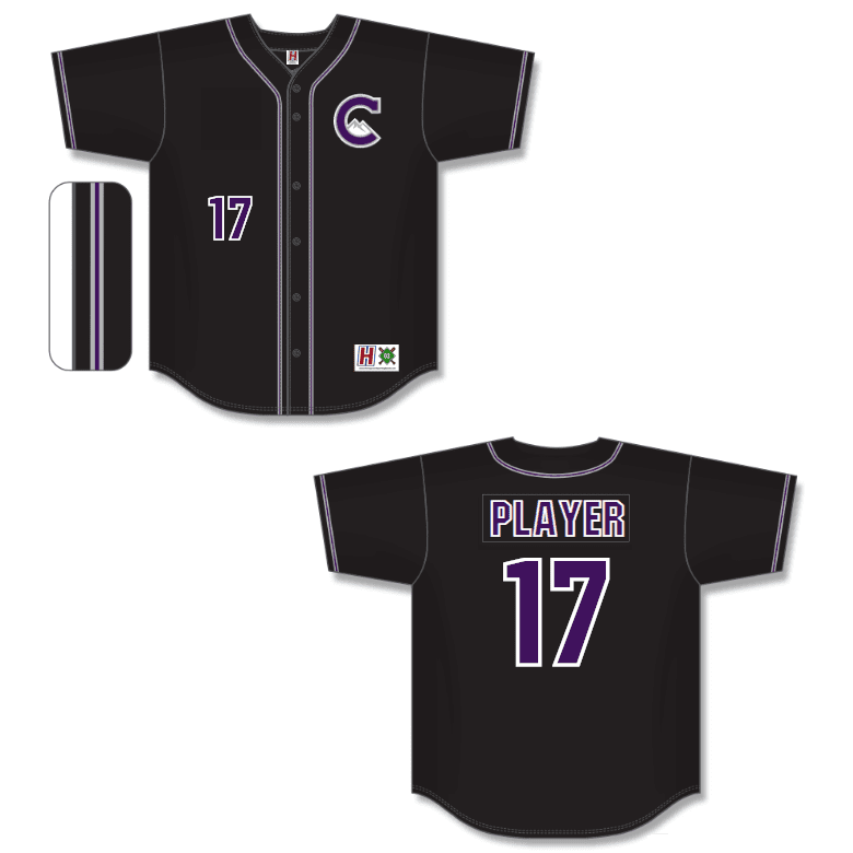 Rockies HG400-COL custom full button baseball jerseys for adult and youth teams. Homegrown HG400-COL retro Rockies pattern features solid black Dura Light Pro wicking fabric body with throwback grey and purple sewn braiding on the sleeve and neck openings.