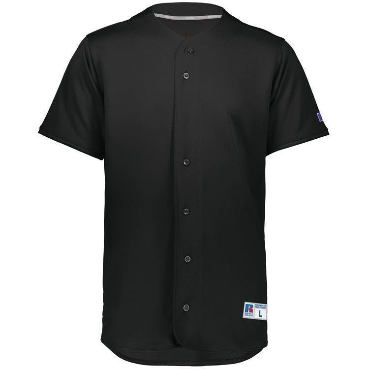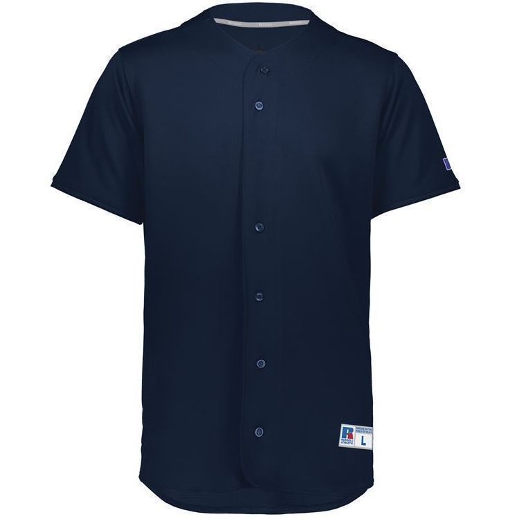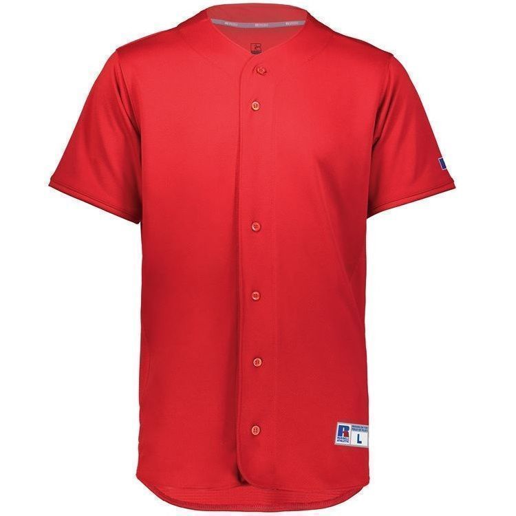 Russell 235JMM full button moisture wicking baseball jersey is made of pro weight Diamond-Knit Dri Power wicking knit fabric with tricot mesh inserts for comfort. Russell 235JMM baseball jersey has a solid color design, full button front, set-in sleeves, tail bottom hem and woven locker label on left bottom.