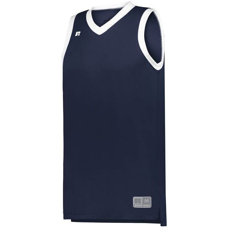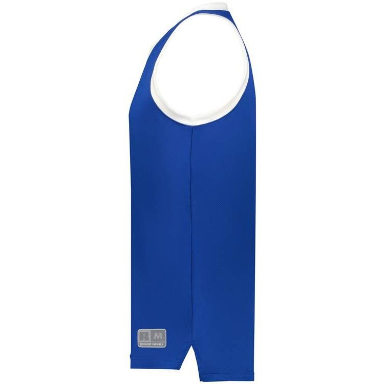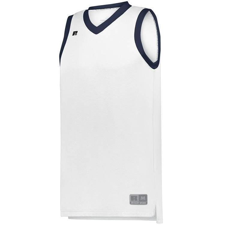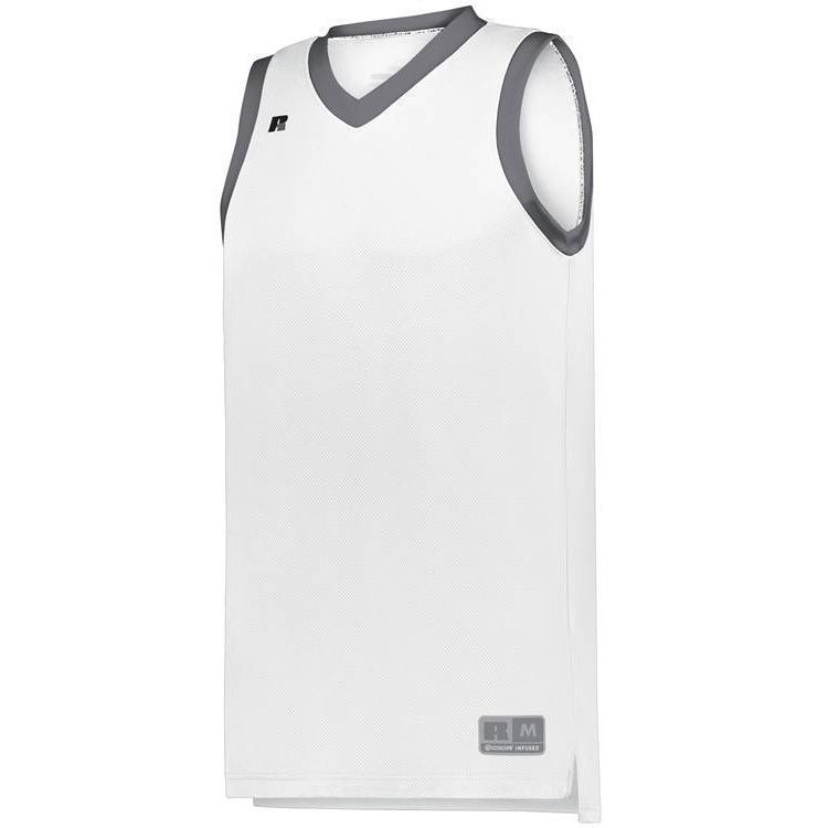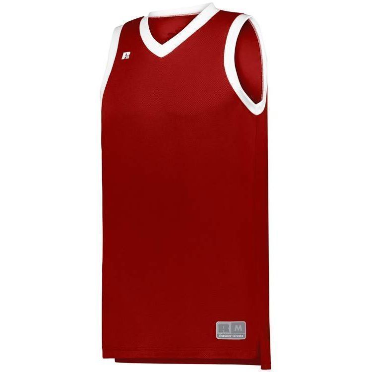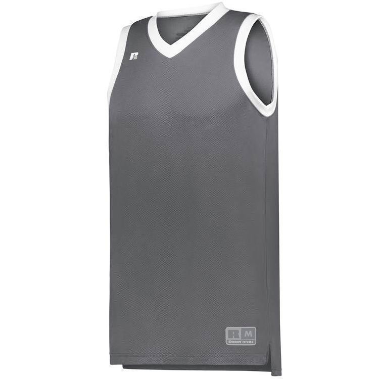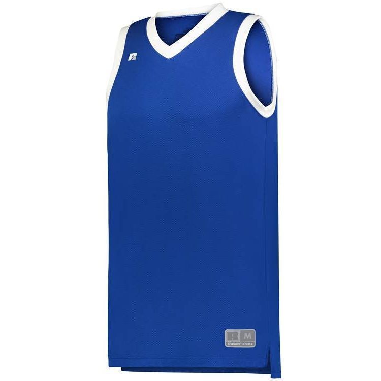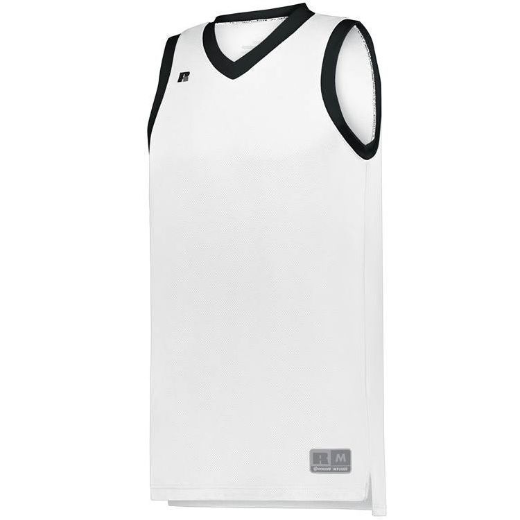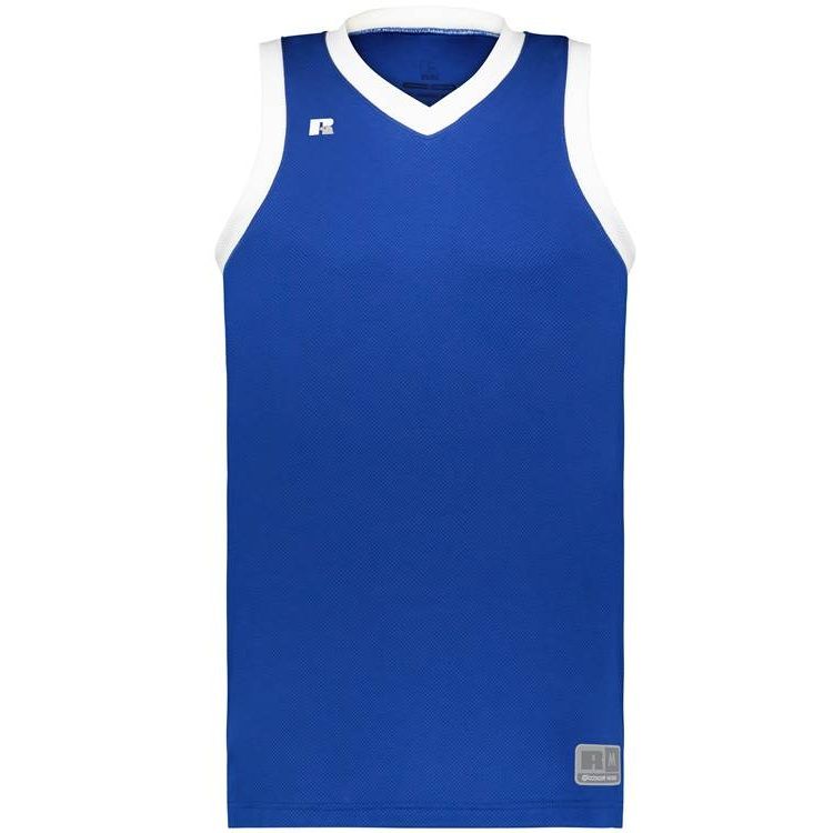 Russell 5R3CHM basketball jersey features 100% polyester 3D honeycomb Dri-power wicking fabric with Coolcore technology for maximum comfort. Russell 5R3CHM basketball jersey also features a modern fit, v-neck collar, angled side vents, semi-fitted collegiate cut, jock tag and double needle hemmed bottom.