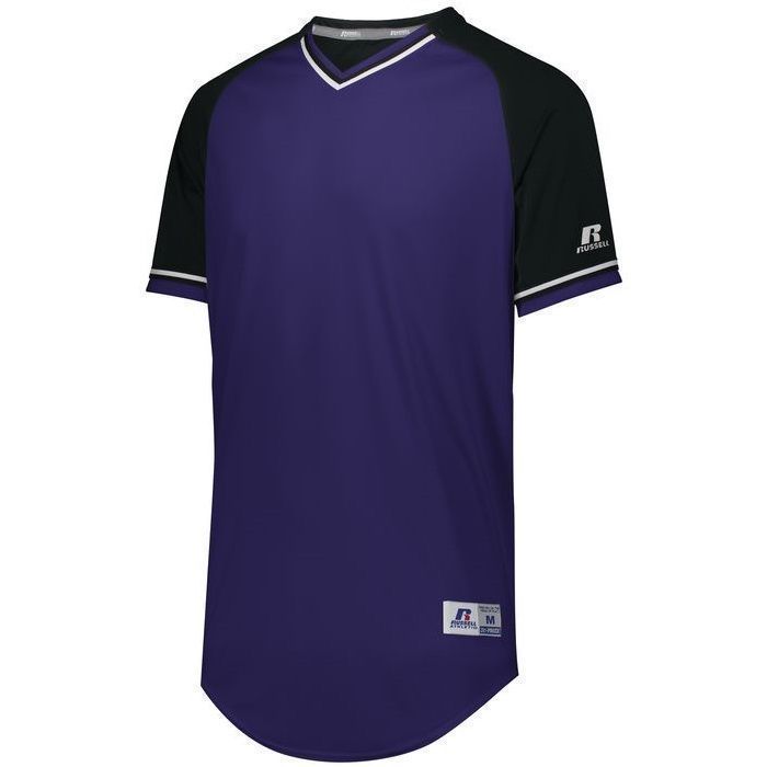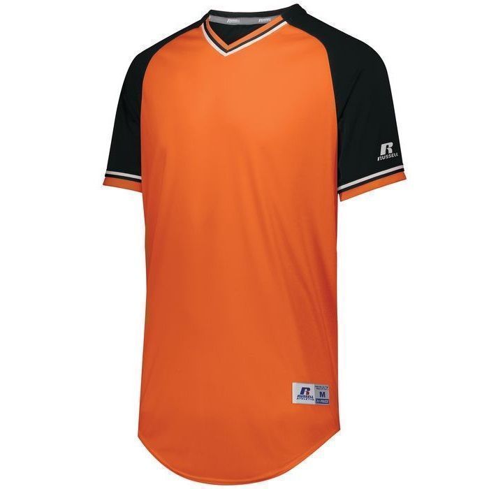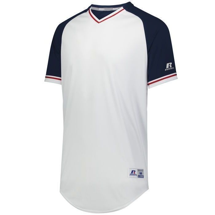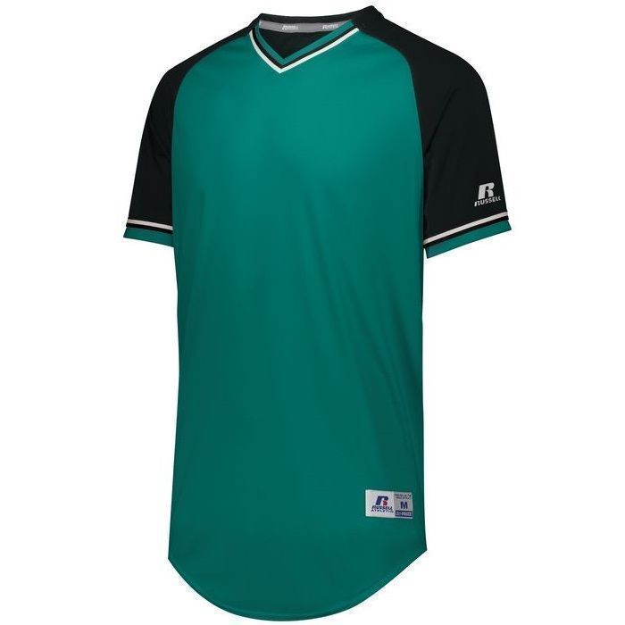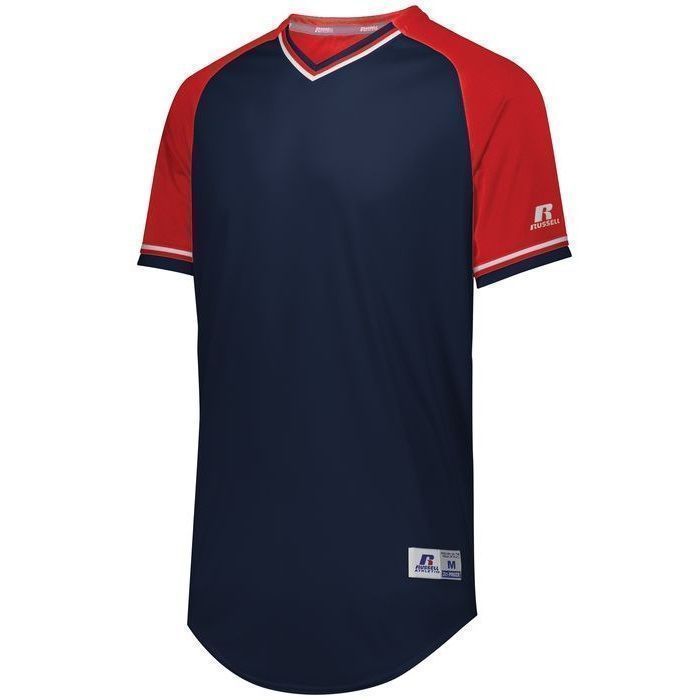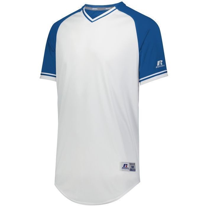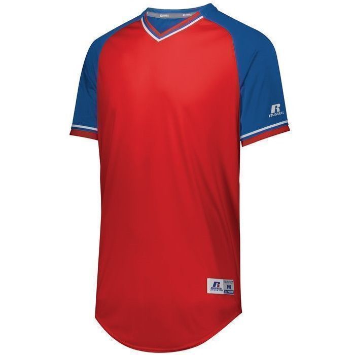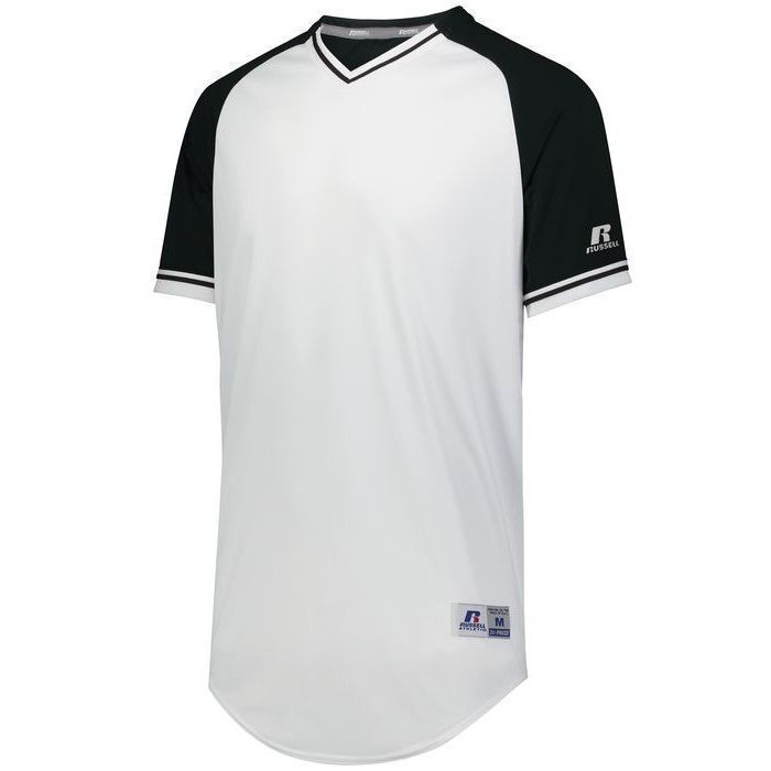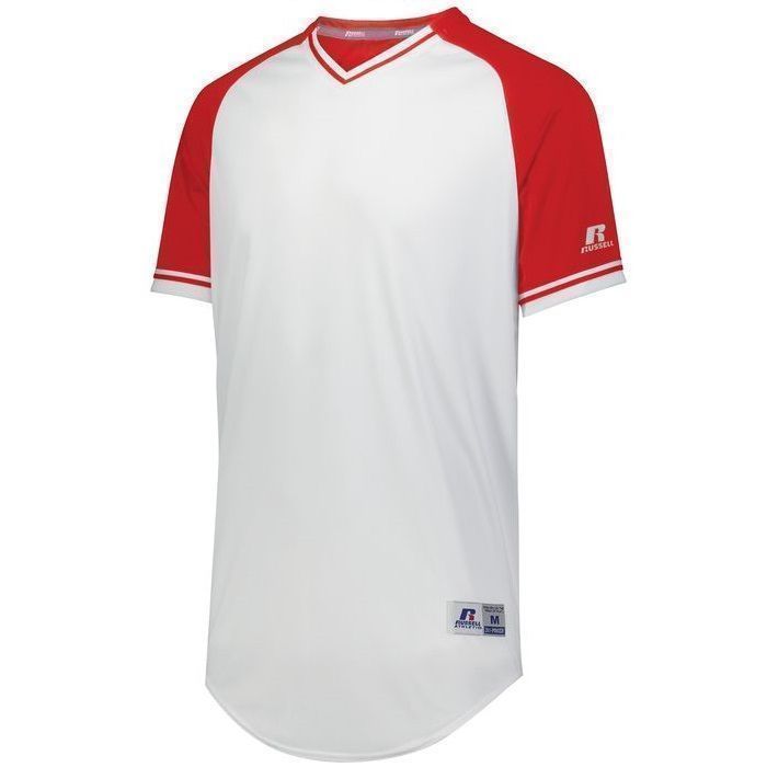 Russell R01X3M v-neck baseball jersey is made of mid weight Dri-Power wicking knit fabric a solid color body, contrast color sleeves and vintage braided trim. Russell R01X3M vintage v neck baseball jersey has raglan sleeves, contoured bottom, outside locker label and double stitched seams. Youth through adult 3XL sizes.