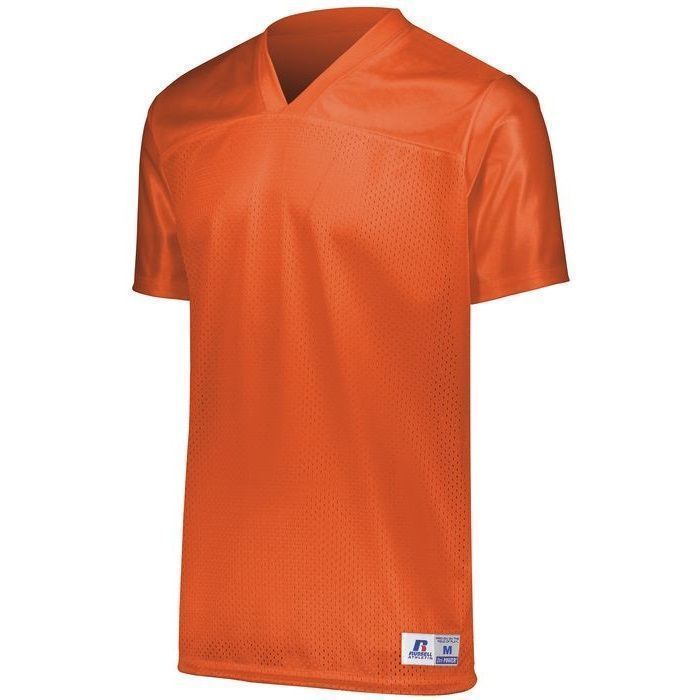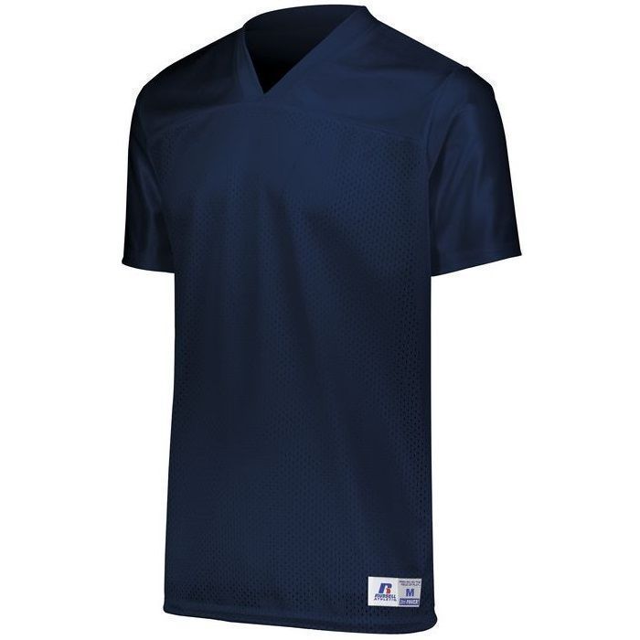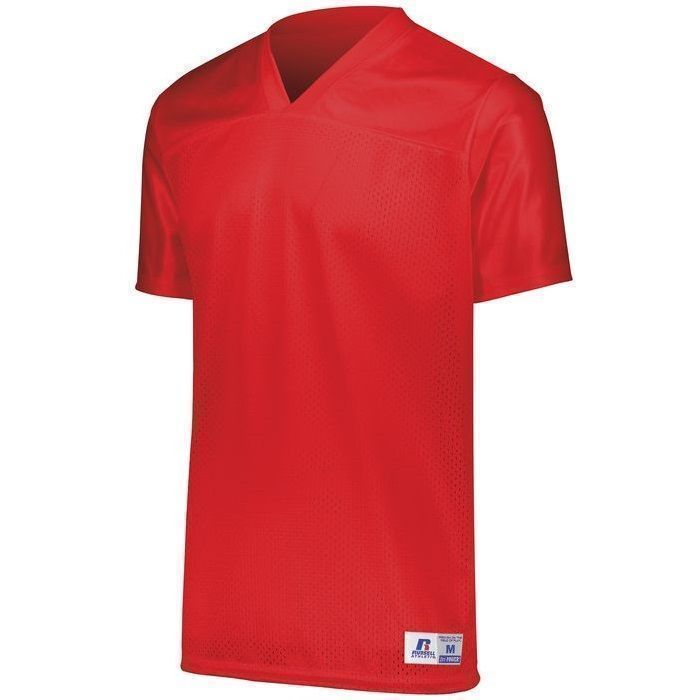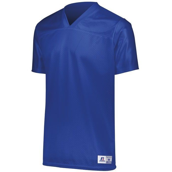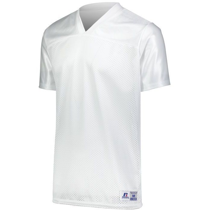 Russell R0593M flag football jersey is perfect for 7 on 7 or rec league play. Russell R0593M jersey features rugged nylon (colors) / poly (white) tricot mesh body with knit cloth yoke and side vents for extra durability. Russell flag football jersey also has a v-neck design, set-in sleeves, outside locker label and reinforced stitching.