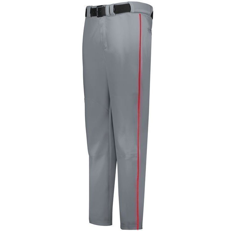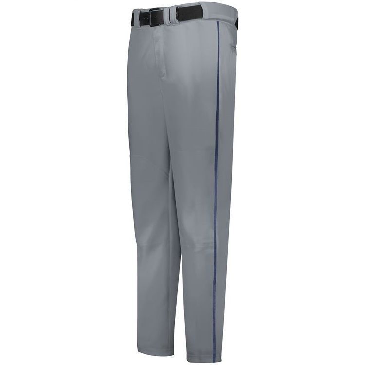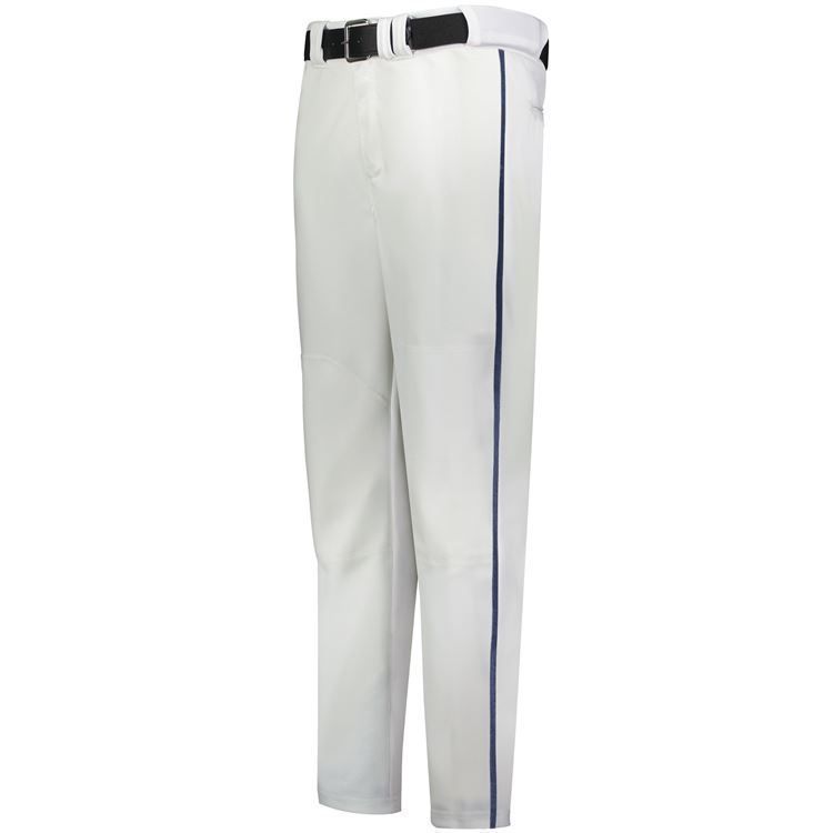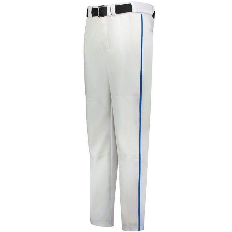 Russell R14DBM adjustable inseam piped baseball pants are made of 11oz. double knit stretch fabric with contrast color side piping. Russell R14DBM baseball pants have open bottom hems with 4 inch Velcro adjustment, 1/8 inch side piping, 2-1/4 inch wide waistband with silicon gripper, 7 pro style tunnel belts loops, double reinforced knees, dual snap closure with zipper, two set-in back pockets with button closure and a relaxed fit.
