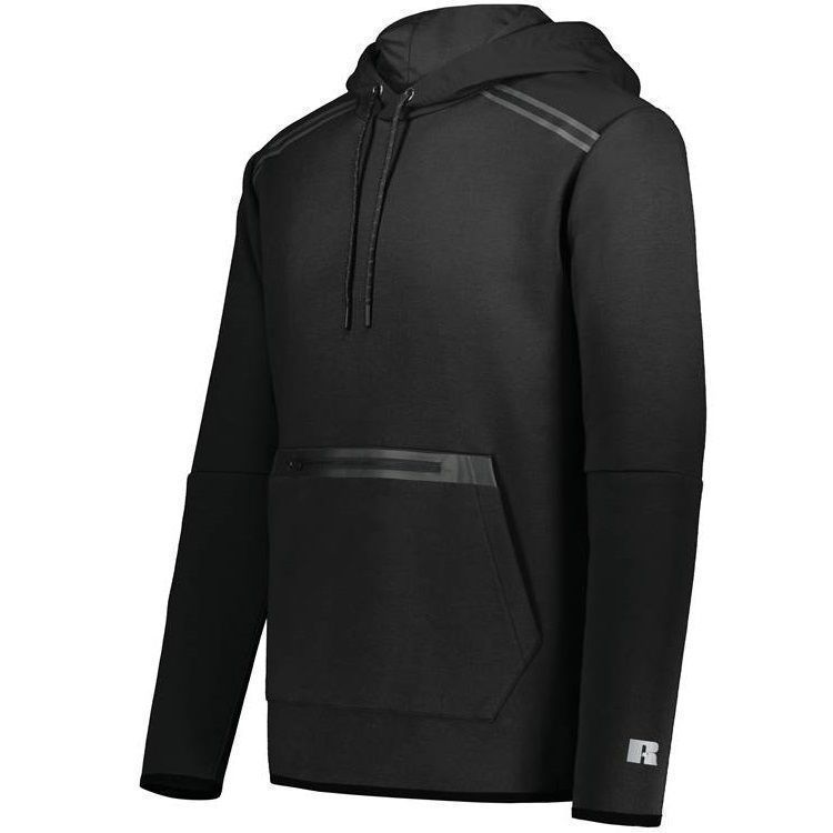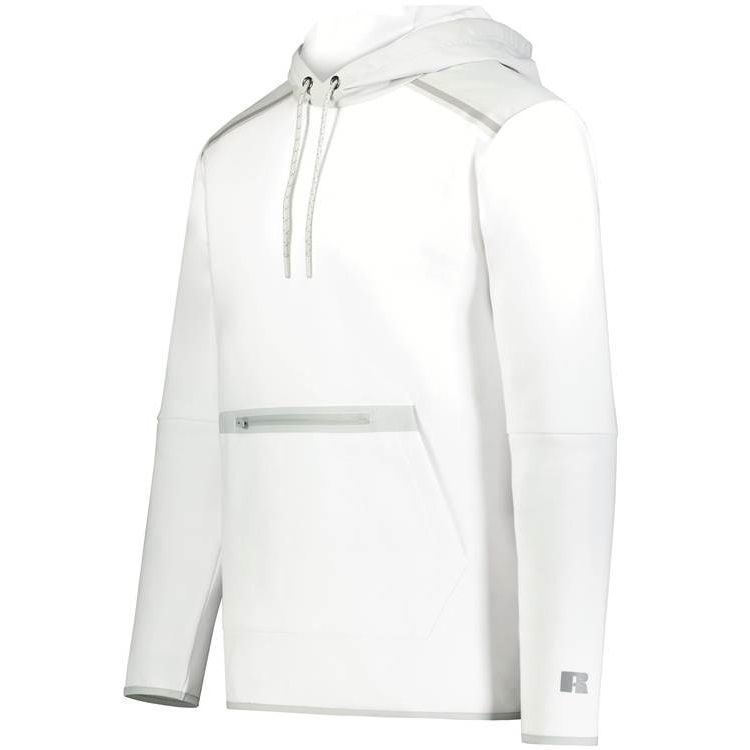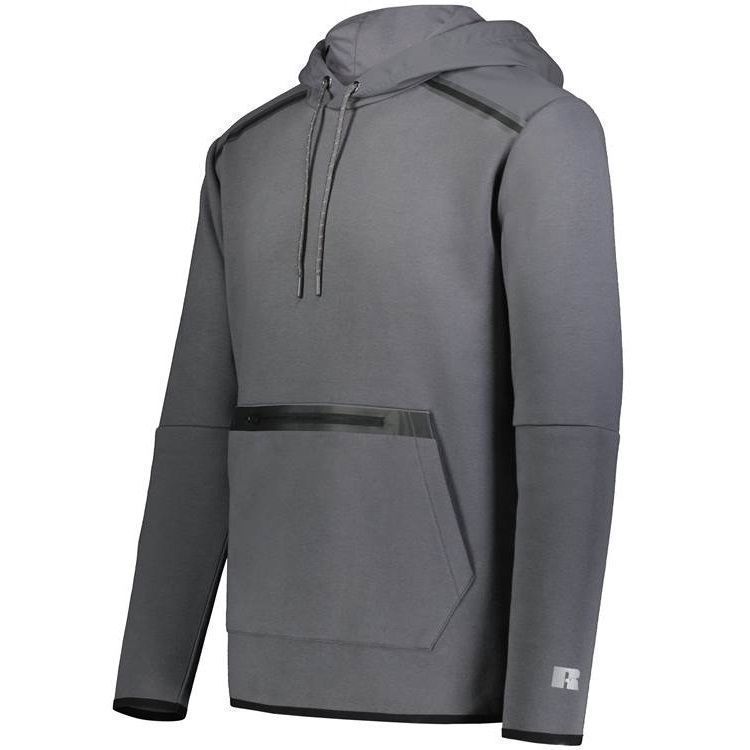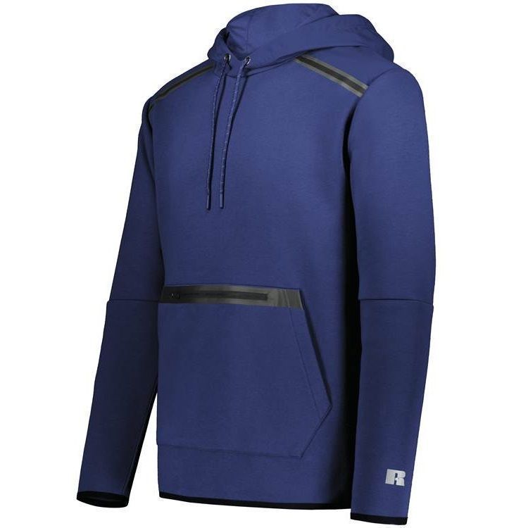 Russell R23TFM Legend hooded sweatshirt features 66% cotton / 34% polyester Dri-Power wicking fleece. Russell Athletic Legend hoodie features water resistant shoulders, hood and back yoke. Also has a 2-ply hood with drawcord, weld tape accents, a front zippered pouch pocket with tape, set-in sleeves, spandex cuffs / bottom band and double needle stitching.