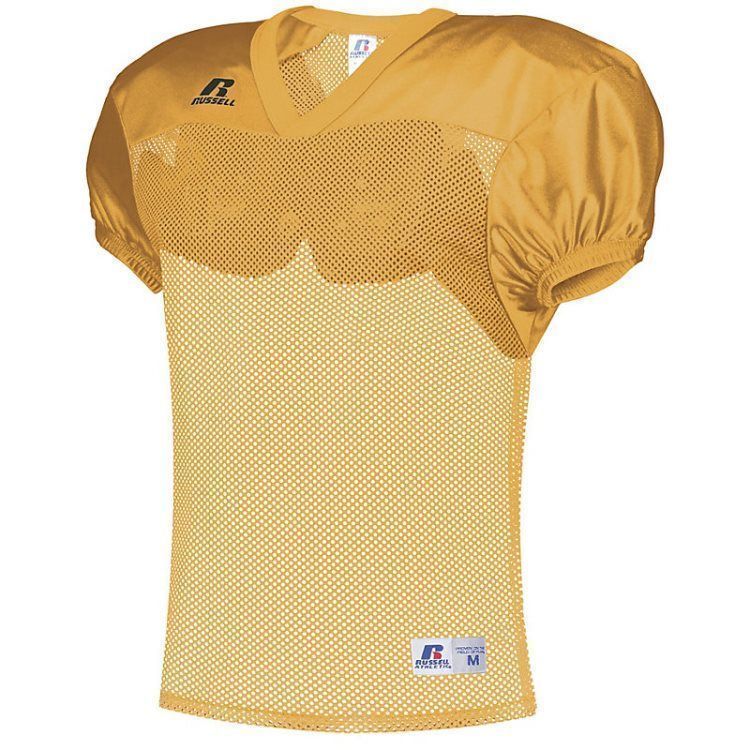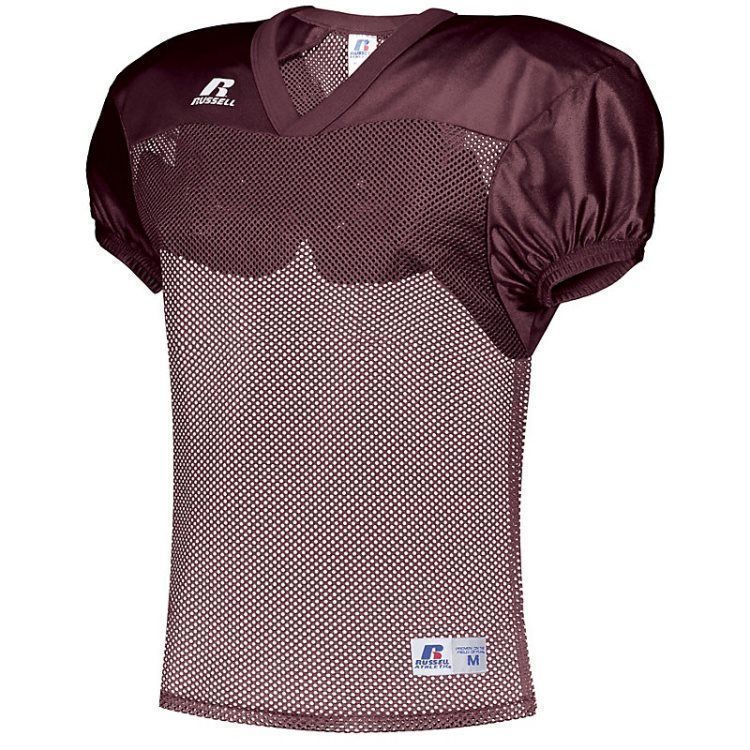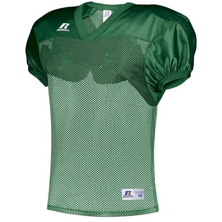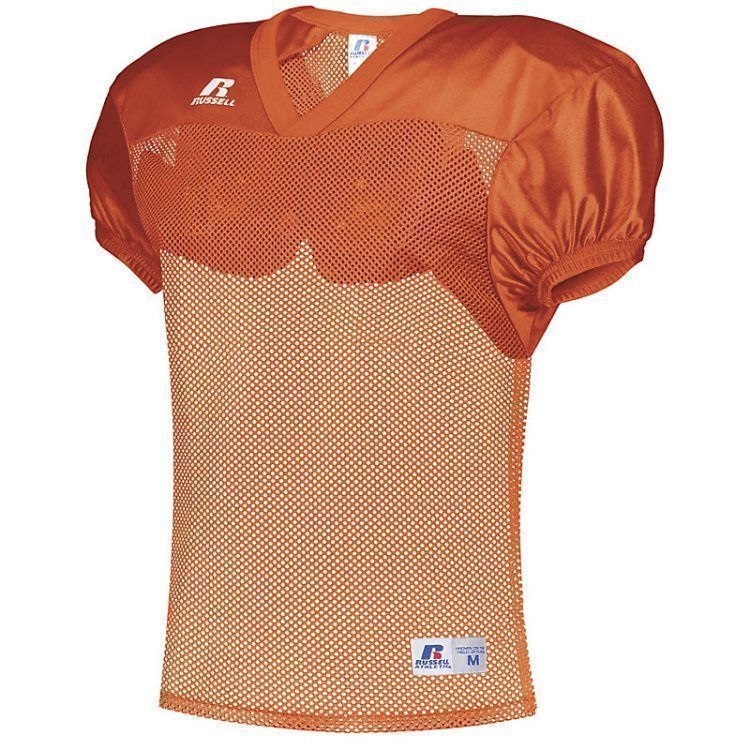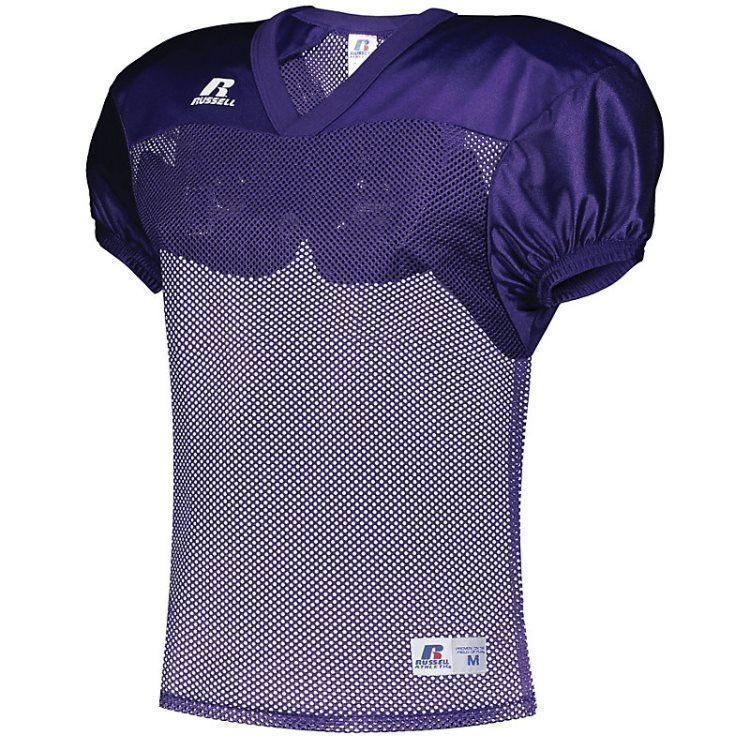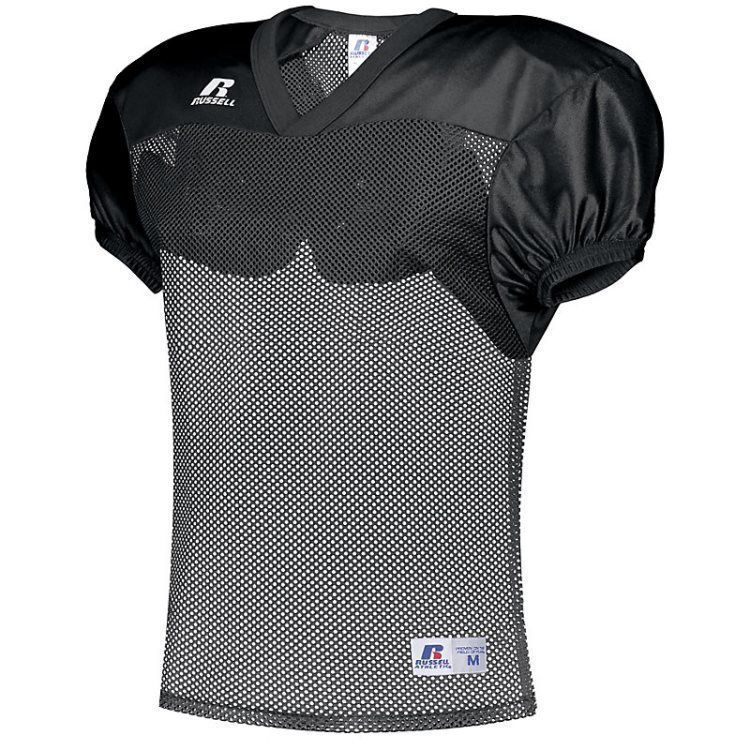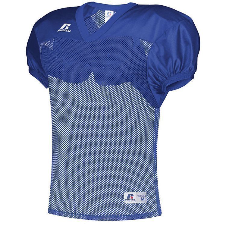 Russell S096BM practice football jersey features polyester mini porthole mesh body with medium weight dazzle warp knit yoke and sleeves. Russell practice football jersey also features a crossover rib knit collar, set-in sleeves, outside locker label and reinforced stitching. Add screen printed team name or numbers on team orders.