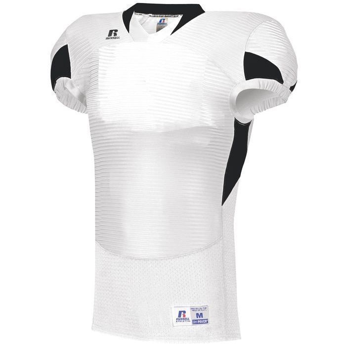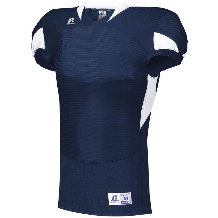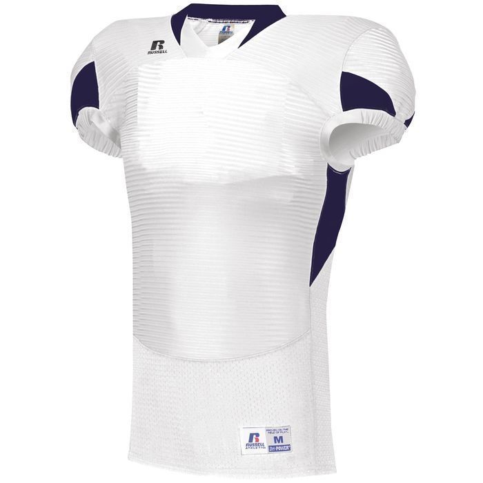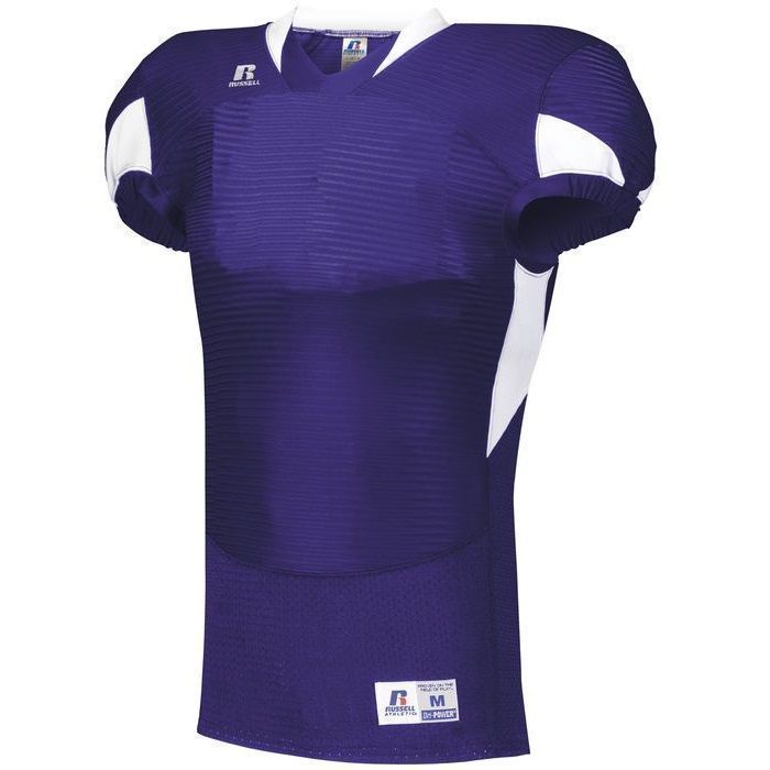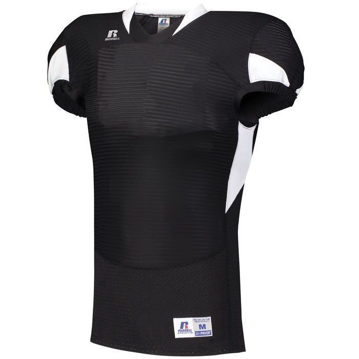 Russell S81XCM waist length pro football jersey features rugged nylon / 14% spandex compression cloth body with SM cloth inserts to limit grab points. Russell waist length pro football jersey also features shoulder pad pockets, v-neck design, set-in cap sleeves, outside locker label and full reinforced stitching.