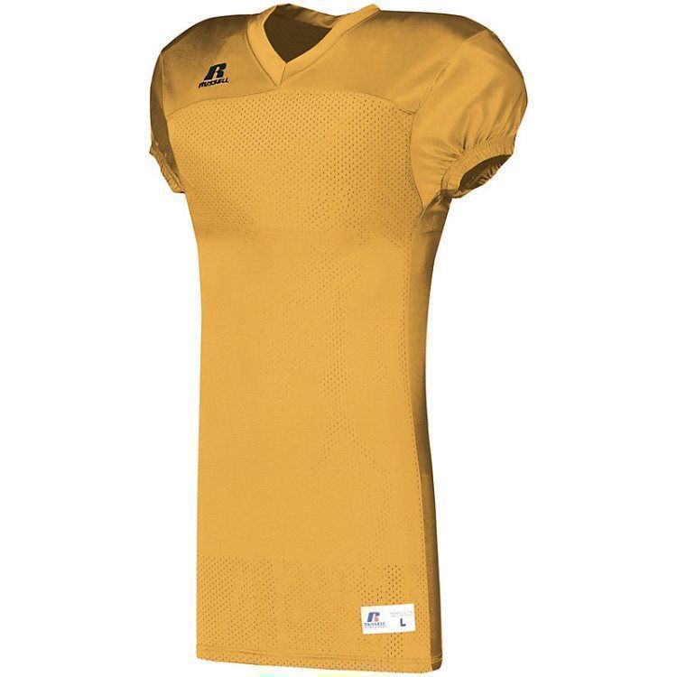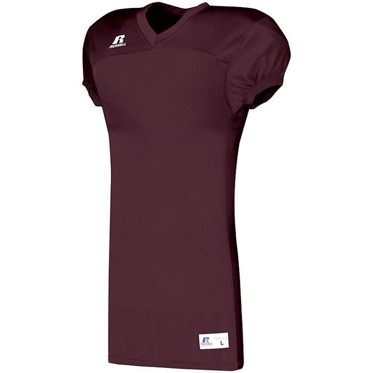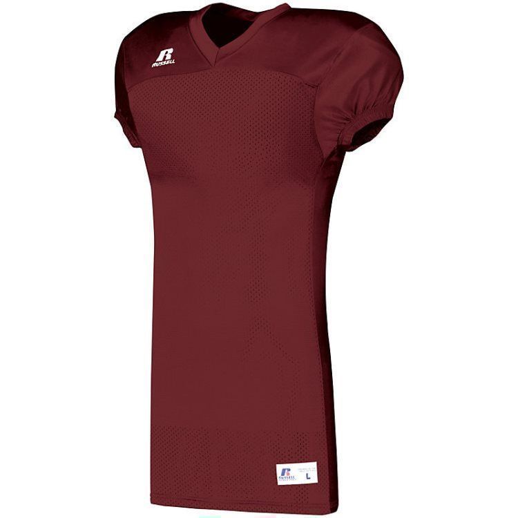 Russell S8623M football jersey features rugged nylon tricot mesh body with poly/spandex side inserts for a fitted look. Russell side insert football jersey also features reinforced warp knit solid yoke / sleeves, v-neck design, set-in sleeves, outside locker label and reinforced stitching.