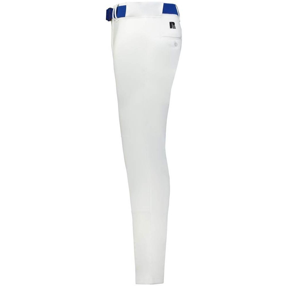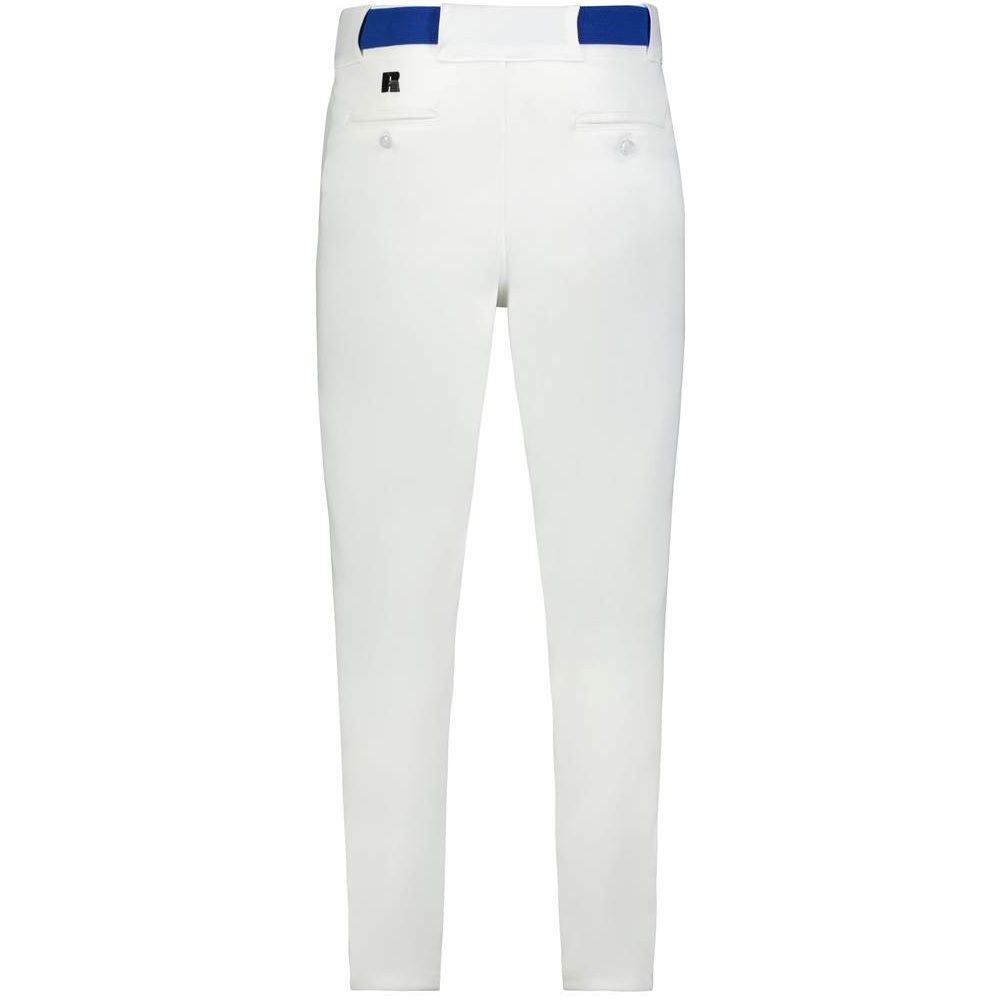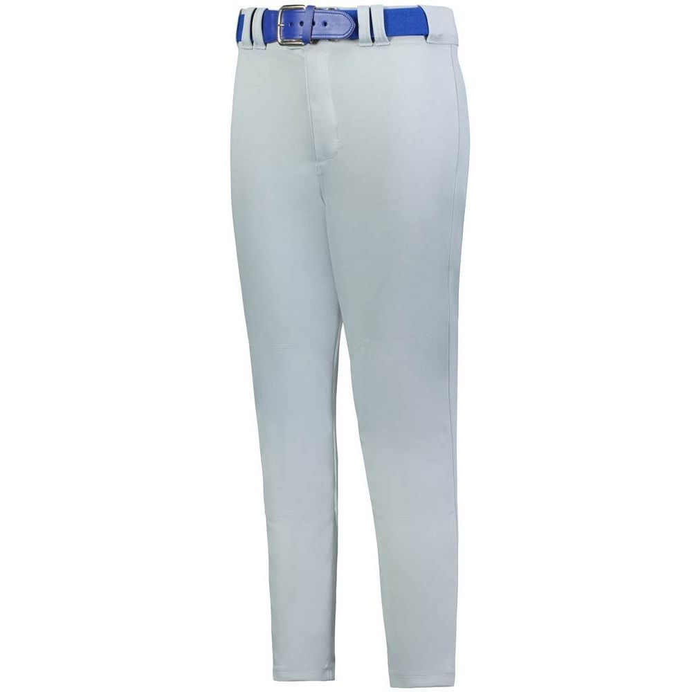 Russell R52LGM Tapered Leg baseball pants are made of 12.5 oz. double knit stretch fabric in a solid color design. Russell R52LGM baseball pants have a 2-1/4 inch wide waistband with silicon gripper, 7 pro style tunnel belts loops, double reinforced knees, dual snap closure with zipper, two set-in back pockets with button closure and a tapered fit for a modern look.