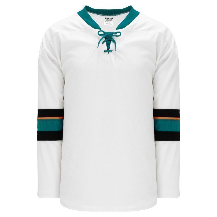 Blank San Jose Sharks home, away and 3rd hockey jerseys feature pro-weight AK-Knit fabric with authentic 2017 Sharks striping pattern. AK SAN466B SAN467B SAN634B Sharks blank hockey jerseys also feature 2-layers of material on the shoulders / elbows, lace up necks and rounded bottom hems. Buy blank or customize with screen printing or tackle twill logos, numbers and player names. Purchase youth through adult goalie cut sizes. Made in Canada.