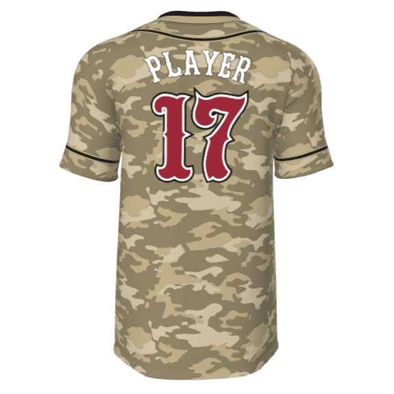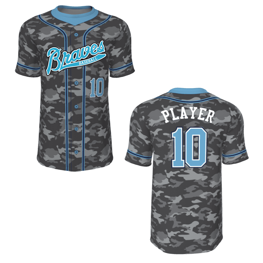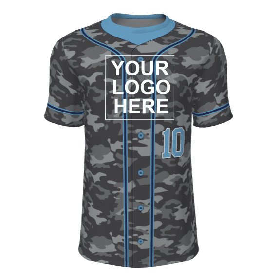 Juice JPL-005 sublimated baseball jerseys for adult and youth teams. Sublimated baseball jerseys are perfect for youth little league through adult leagues. Juice JPL-005 pattern features button down look, camo pattern, placket / sleeve stripes and allows for a front custom logo, front lower left number with player name / number on the back.