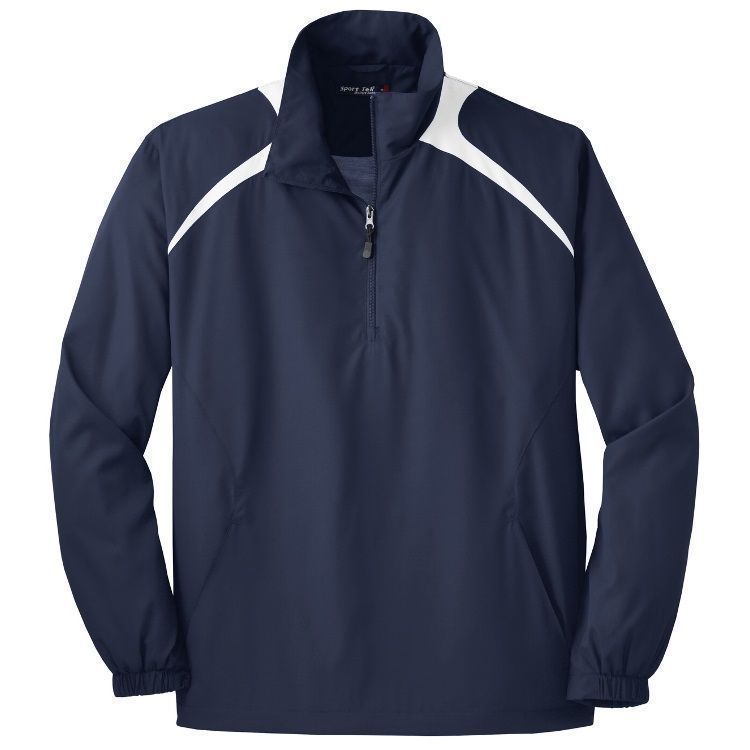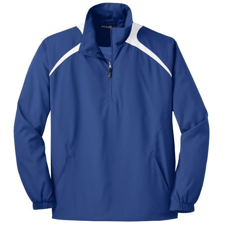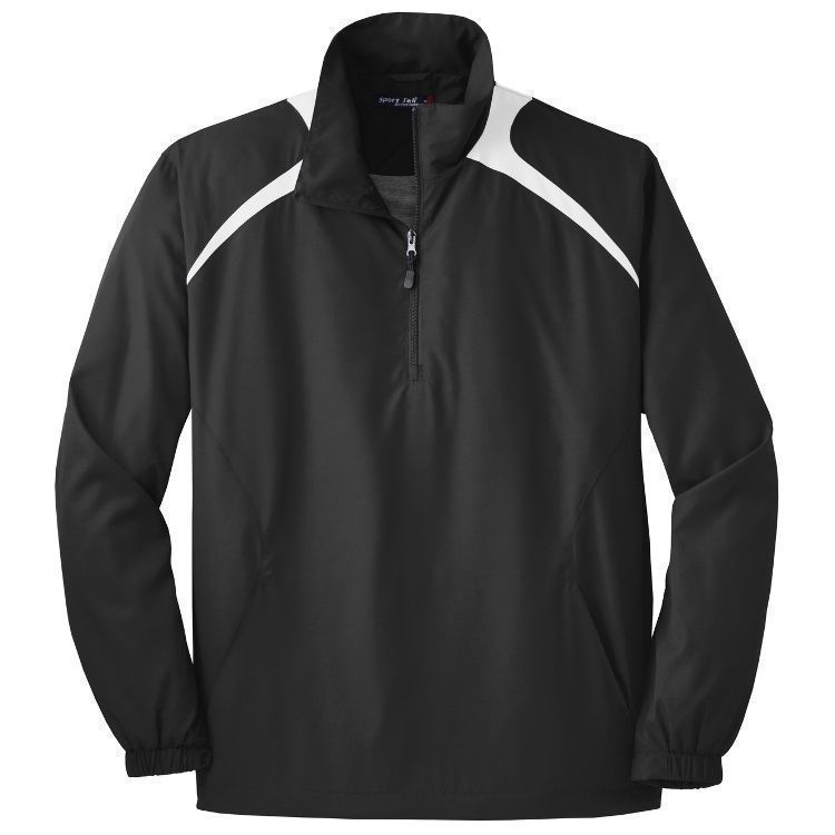 Sport-Tek JST75 1/2 Zip Pullover Hooded Wind Jacket features a 100% polyester with jersey lining / mesh inserts at gussets for added breath ability. Sport-Tek JST75 jacket also features raglan sleeves, articulated elbows for mobility, partially elastic cuffs, contrast color color block accents, 1/2 zip front, side zip for easy on/off, and a bottom drawcord with toggle.