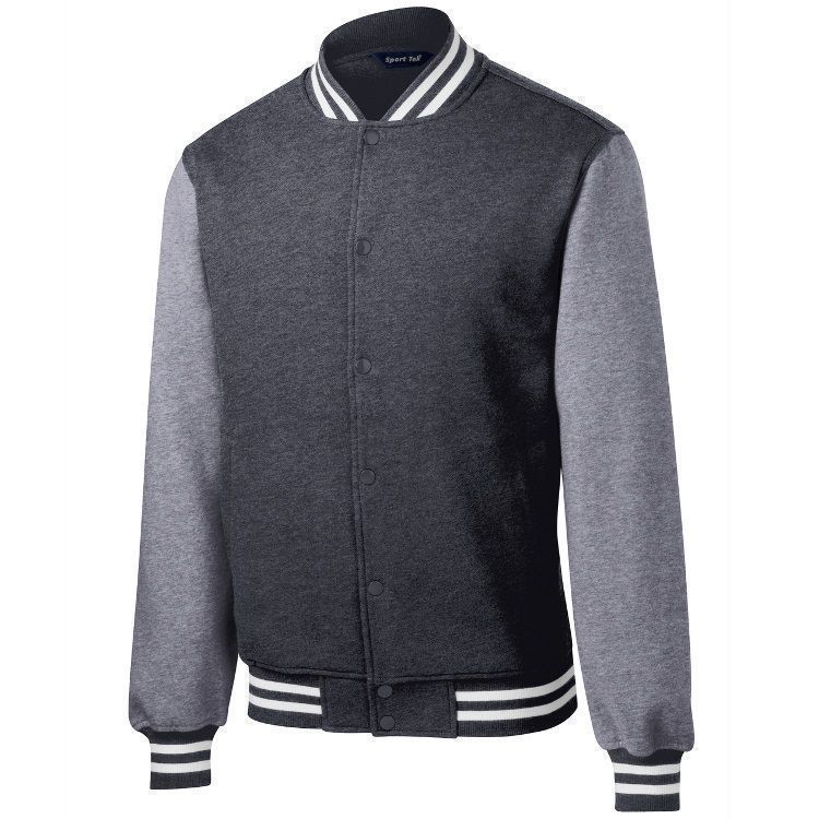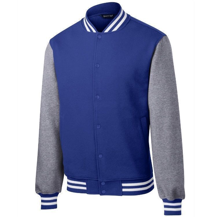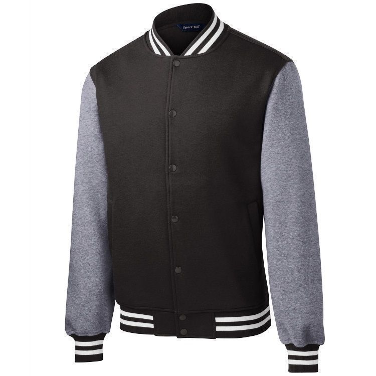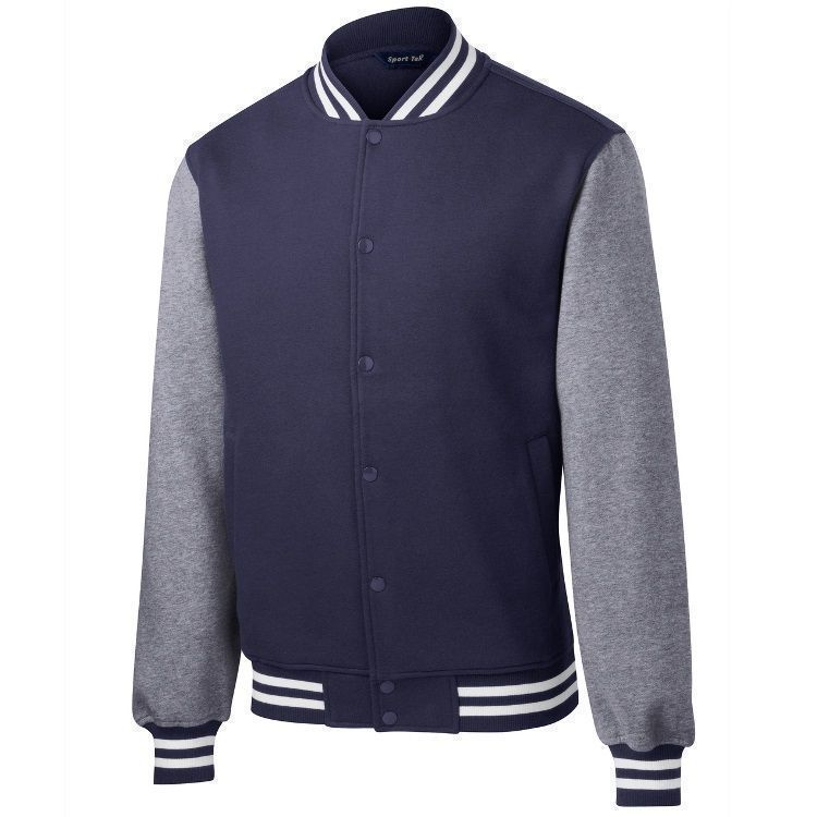 Sport-Tek ST270 Fleece Letterman Jacket features 9.0oz 65/35 ring spun combed cotton / poly heavyweight fleece body and sleeves. Sport-Tek letterman jacket also features a 2x2 rib knit spandex collar / cuffs / hem, full snap front, front slash pockets and a dye-to-match twill taped neck.