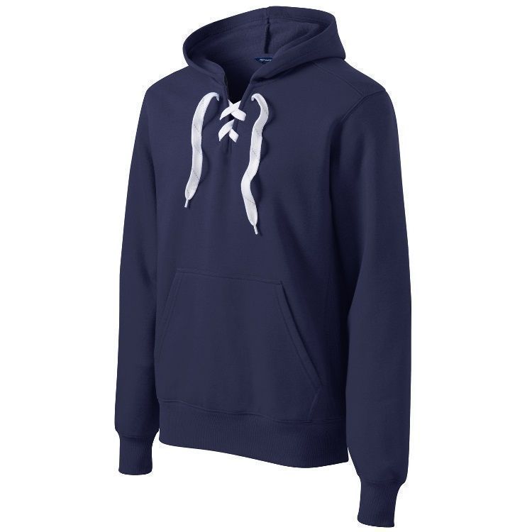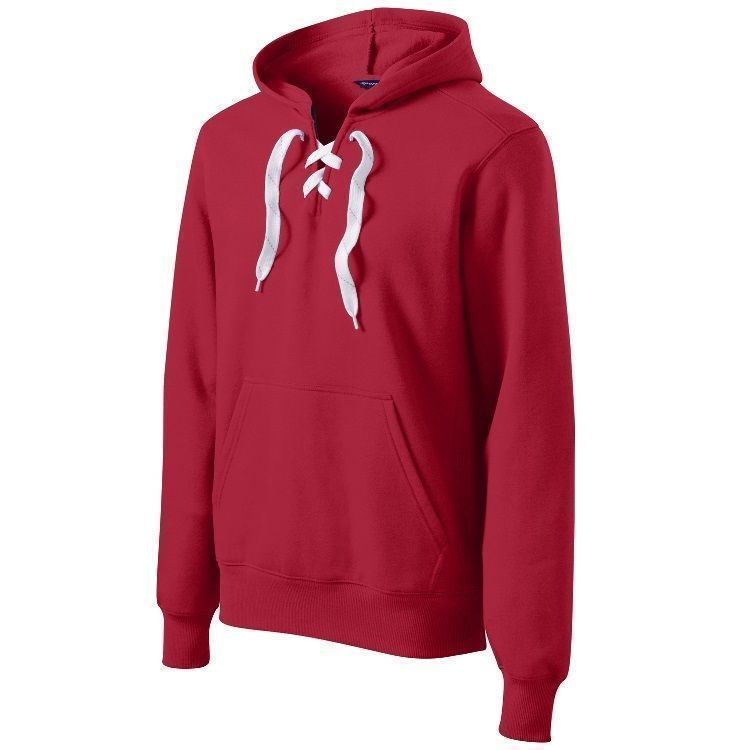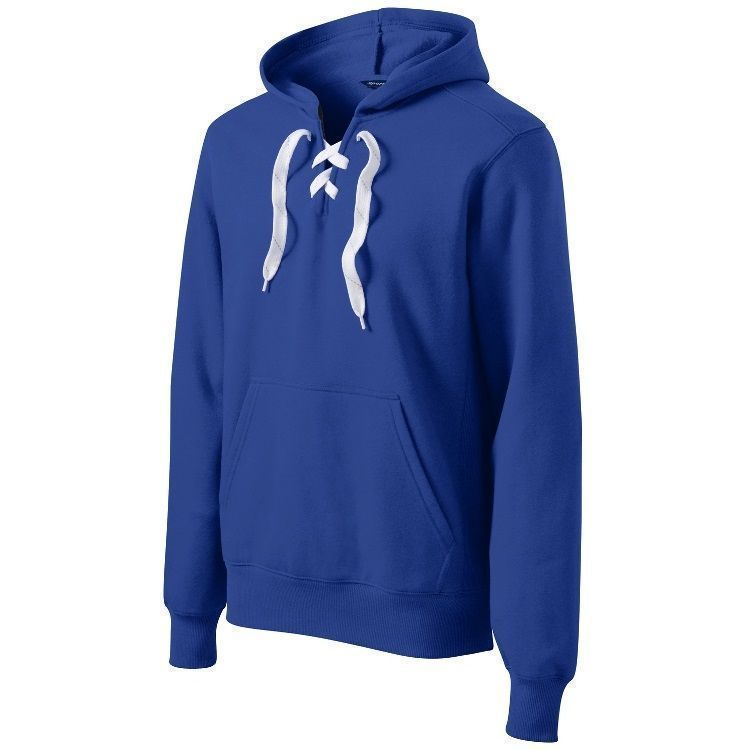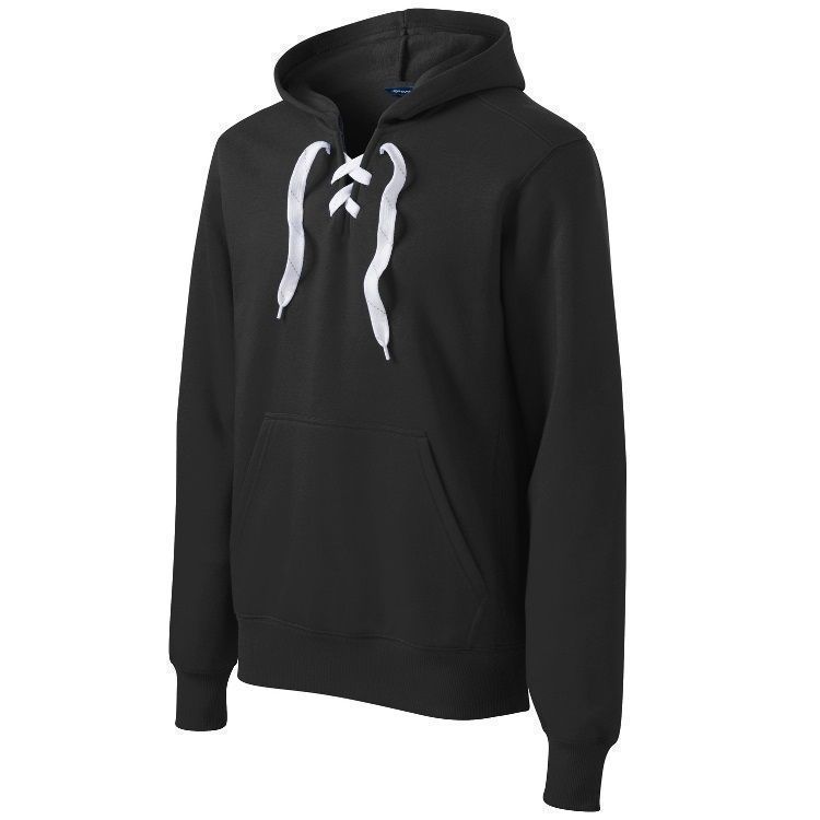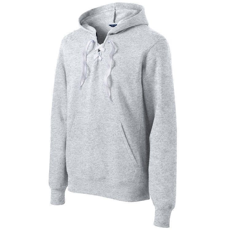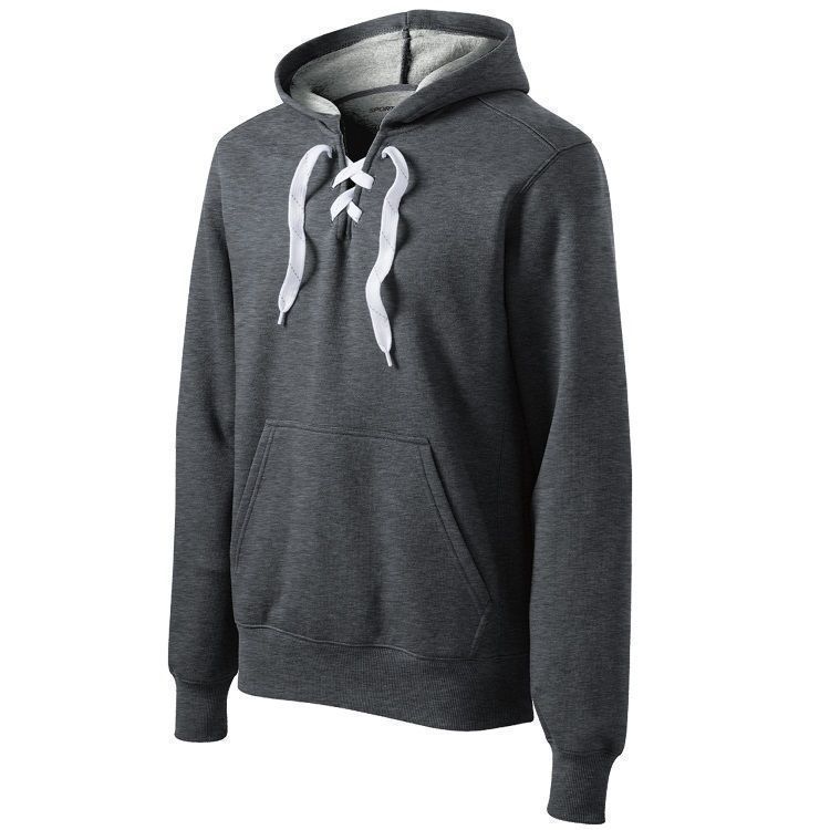 Sport-Tek ST271 throwback hockey hoodie features an ultra soft 9 oz. poly cotton ring-spun fabric with a kangaroo front pocket and skate lace tie design. Sport Tek lace up hockey hoodie features a solid design with 2 inch rib knit cuffs and waist design.