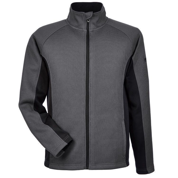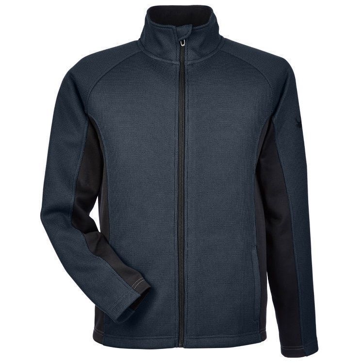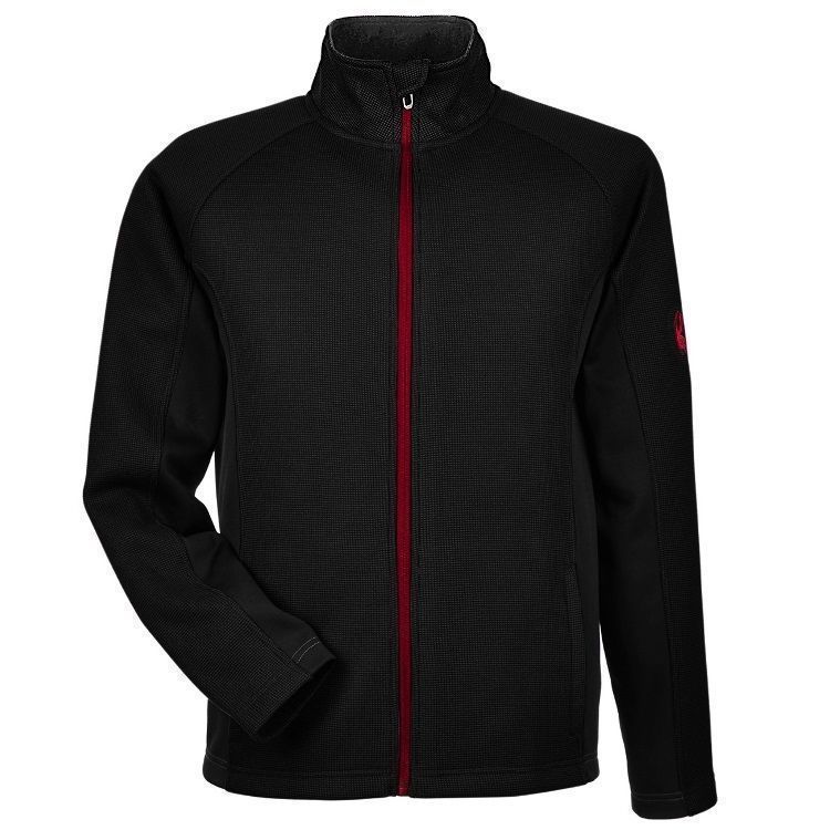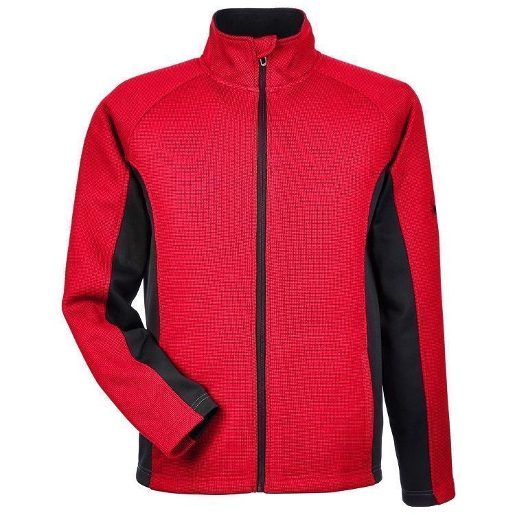 Spyder 187330 Constant mens sweater full zip fleece in a custom jacquard knit design. Spyder Constant jacket features sweater knit outer later bonded to fleece, brush microdenier tricot inner collar, reverse coil full zip front, zippered hand warmer pockets, raglan sleeves, with embroidered Spyder logo on the left sleeve and upper back. Request a quote with your custom team logo.