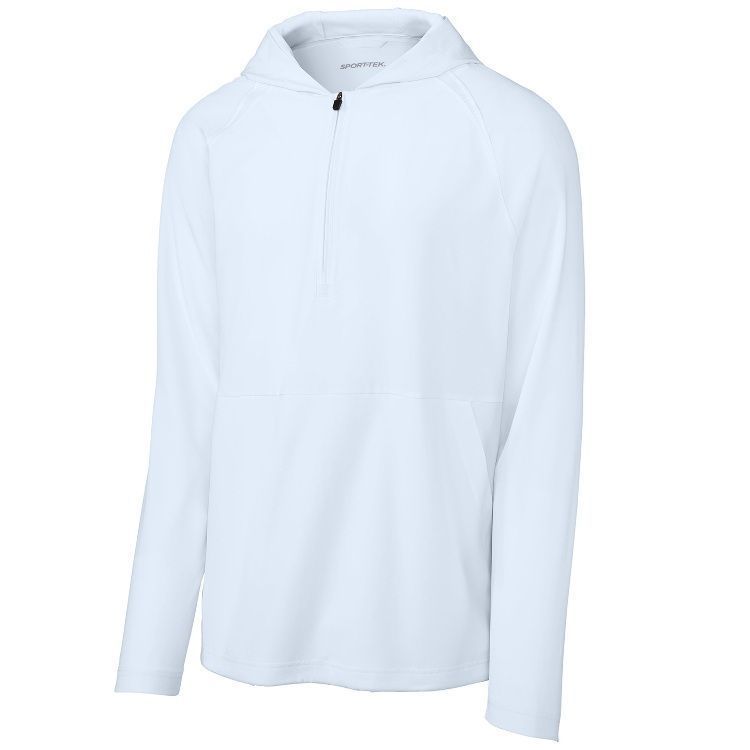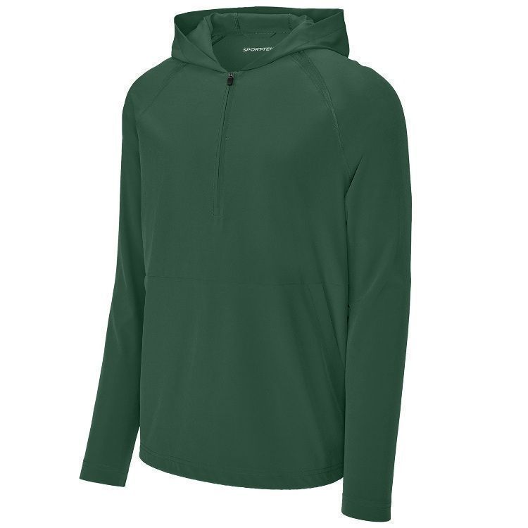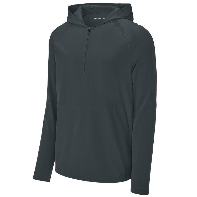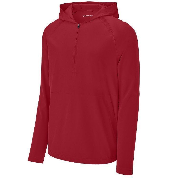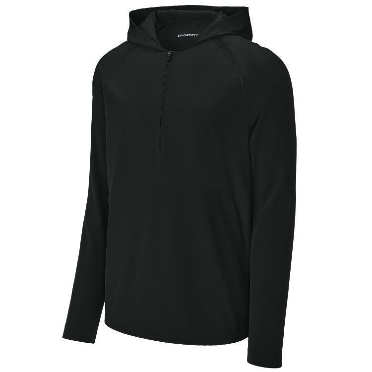 Sport-Tek JST488 1/2 Zip Pullover Hooded Wind Jacket features a 3.5oz. 90% polyester / 10% spandex fabric with hood. Sport-Tek JST488 Repeat jacket also features tricot mesh mesh insert, 1/2 zip front, drawcord hood with toggle, front pocket and a bottom drawcord with side toggle.