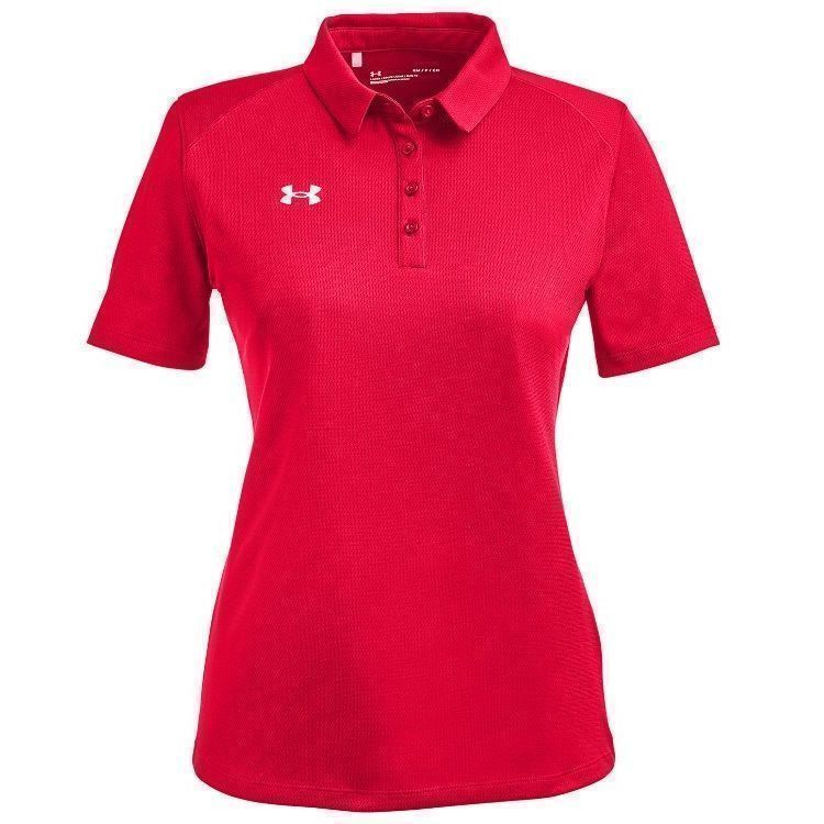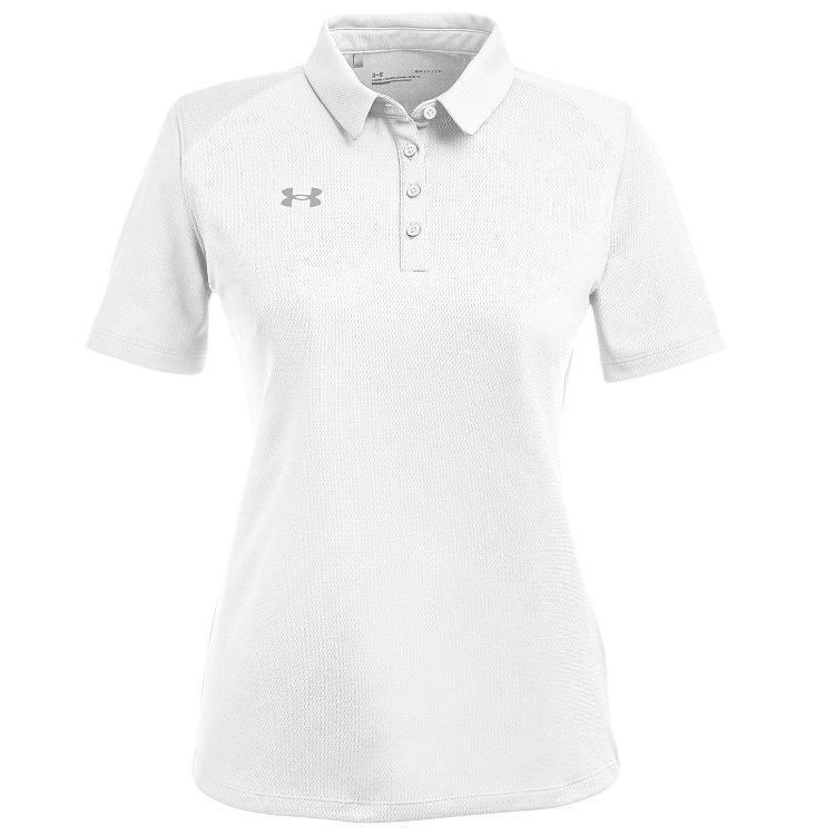 Under Armour Golf womens tech polo in textured wicking fabric with antimicrobial technology. UA Golf 1370431 womens polo has a slight textured finish, self fabric collar, a 4 button placket, open hem sleeves and UA logo on the right chest. Prices include custom logo embroidery.