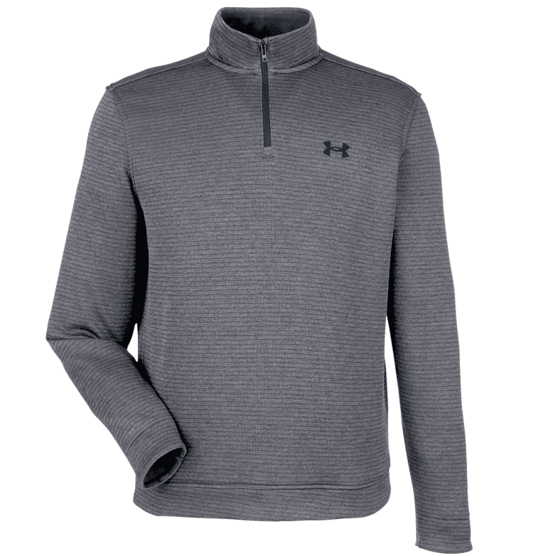 Under Armour Golf Storm Sweaterfleece pullover in heavyweight polyfleeve material with ribbed texturedfinish. UA Golf 1373674 sweater pullover has a 1/4 zip front with contrast zipper, soft brushed interior, water resistant finish, stand up collar and UA logo on the left chest. Prices include custom logo embroidery.