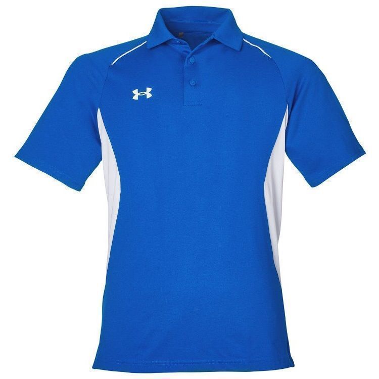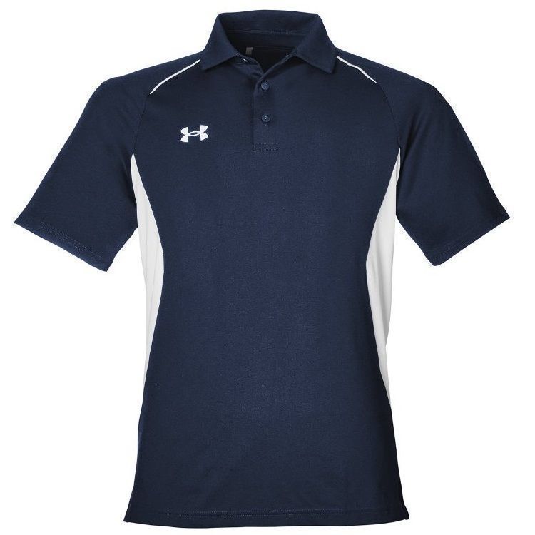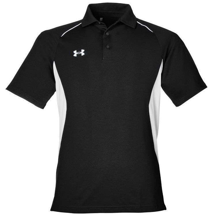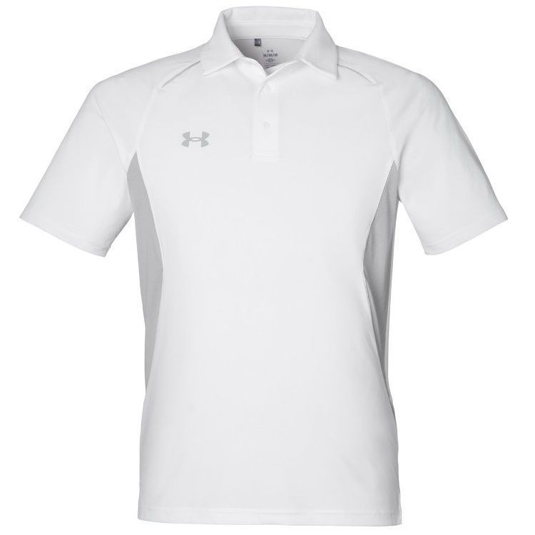 Under Armour Golf Title 2.0 golf polo in polyester wicking microthread fabric with contrast color side and shoulder stripes. UA Golf 1383263 polo has a self fabric collar, a classic 3 button placket, side vents and UA logo on the right chest and upper back. Prices include custom logo embroidery.