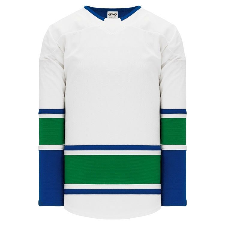 Blank Vancouver Canucks home and away hockey jerseys feature pro-weight AK-Knit fabric with authentic Canucks 2019 striping pattern. AK VAN378B VAN379B Canucks blank hockey jerseys also feature 2-layers of material on the shoulders / elbows, edge v-necks, sewn striping and rounded bottom hems. Buy blank or customize with screen printing or tackle twill logos, numbers and player names. Purchase youth through adult goalie cut sizes.