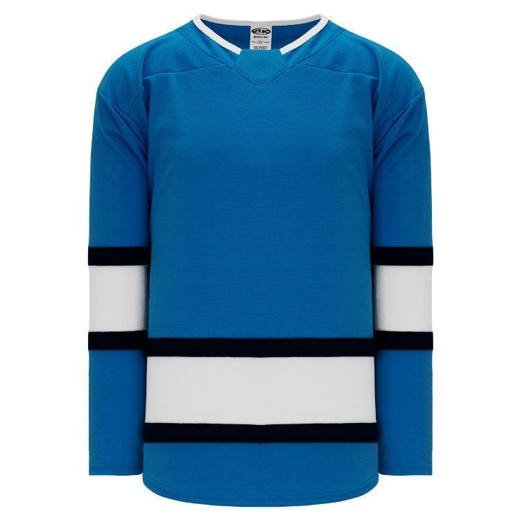 Blank Winnipeg Jets home, away and 3rd hockey jerseys feature pro-weight AK-Knit fabric with authentic Jets blue striping pattern. AK WIN7245B WIN725B WIN776B Winnipeg Jets blank hockey jerseys also feature 2-layers of material on the shoulders / elbows, edge lace up necks, sewn striping and rounded bottom hem. Buy blank or customize with screen printing or tackle twill logos, numbers and player names. Purchase youth through adult goalie cut sizes.